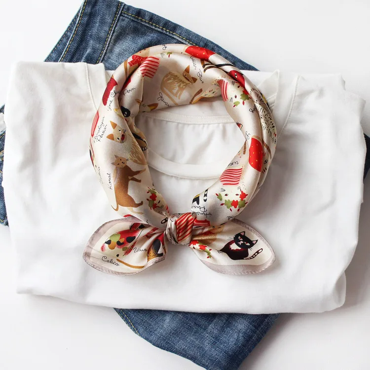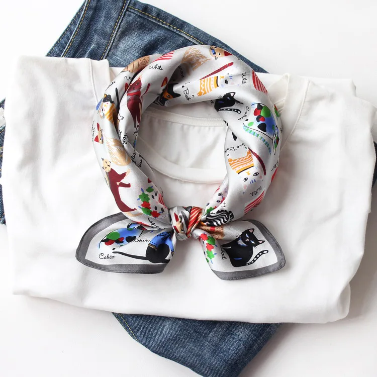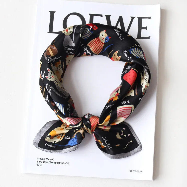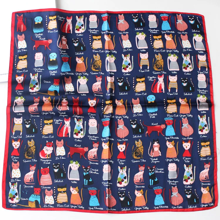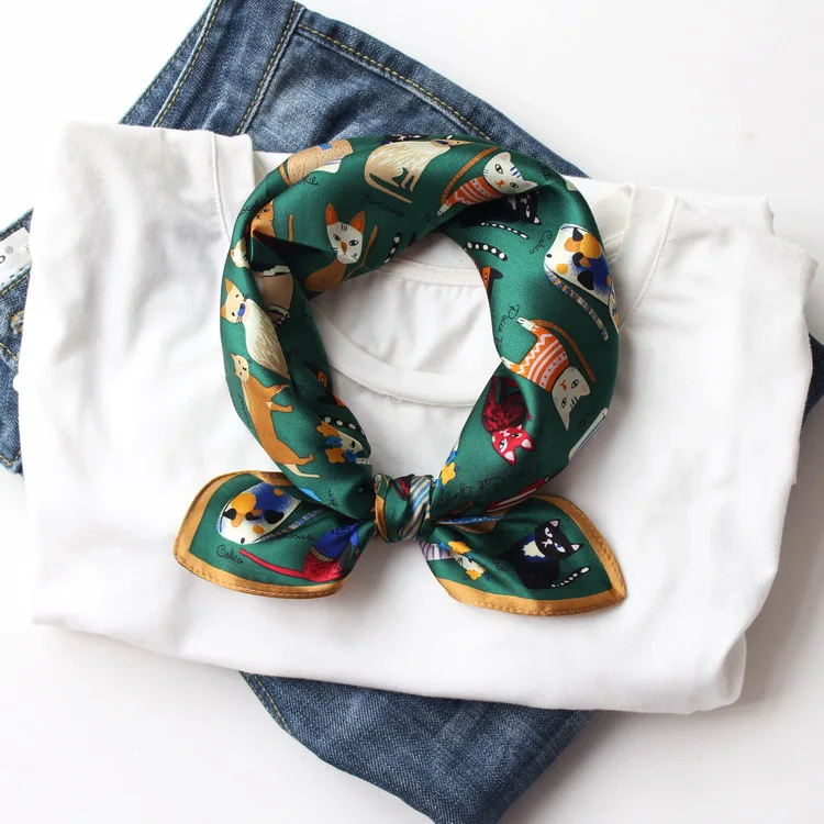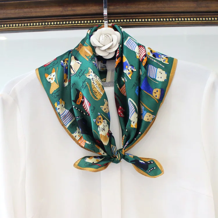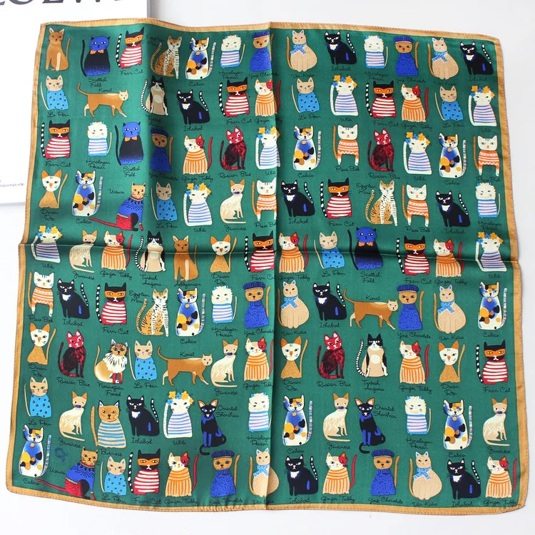 Шарф из натурального шелка с принтом мультяшного кота, 53 см