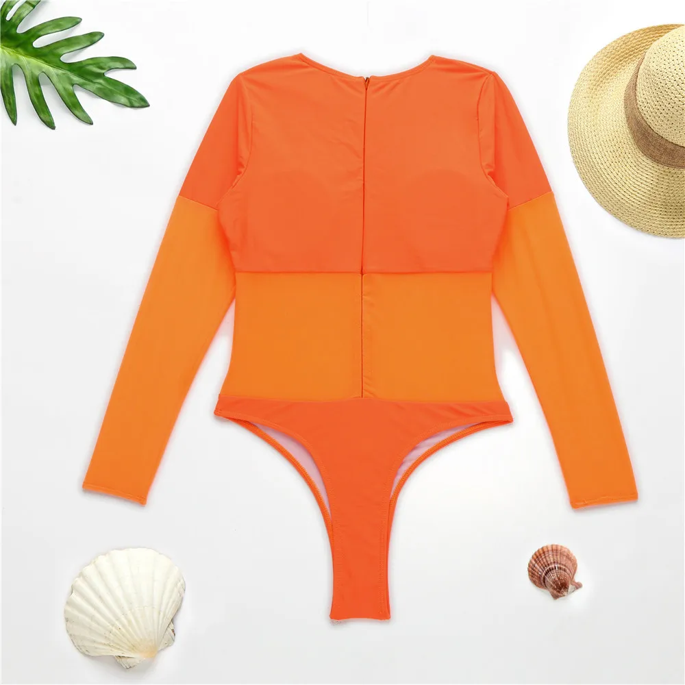2020 сетчатый купальник, Женский цельный купальник на молнии, сексуальный купальный костюм с пуш-ап и длинным рукавом, Женское боди, Женская однотонная пляжная одежда