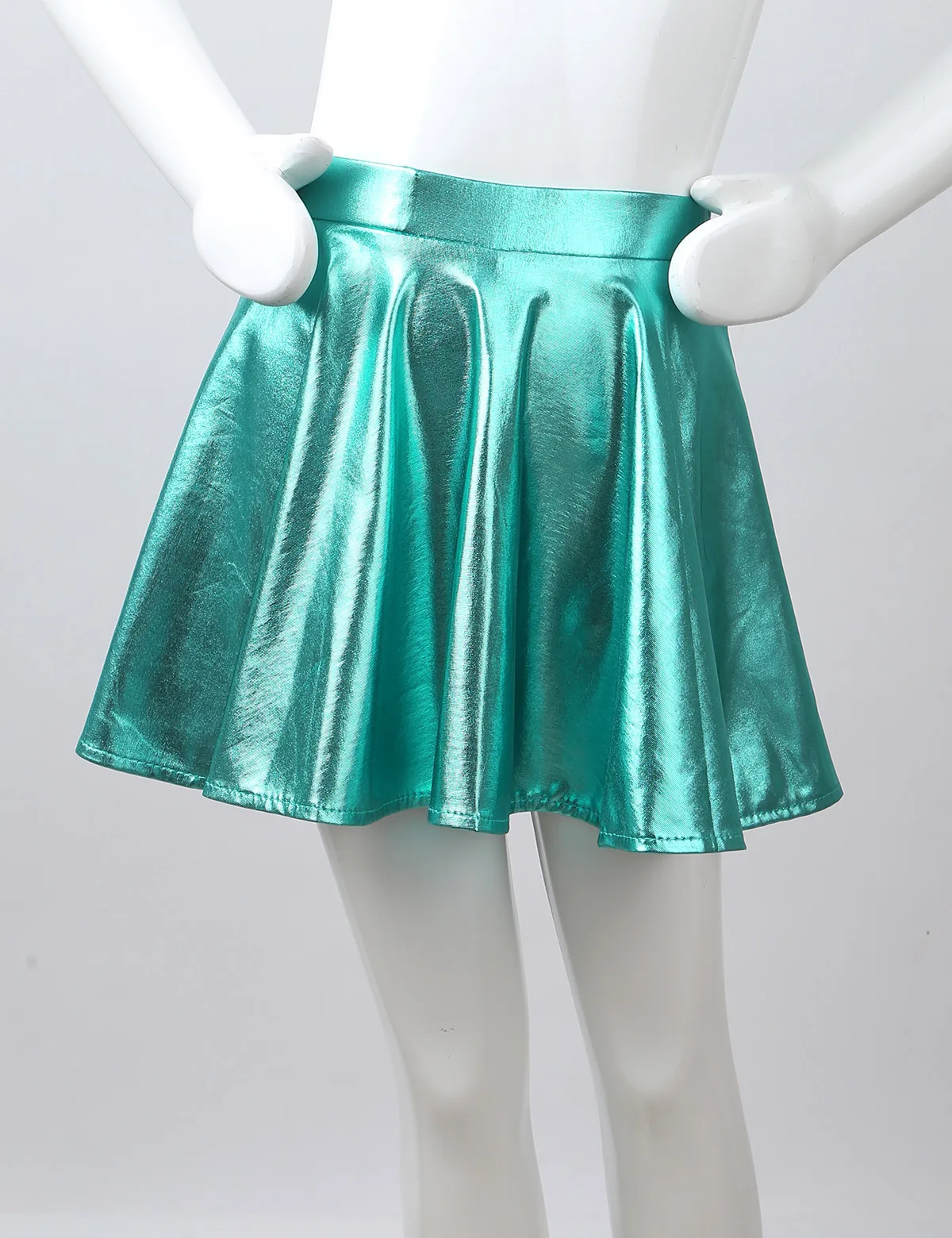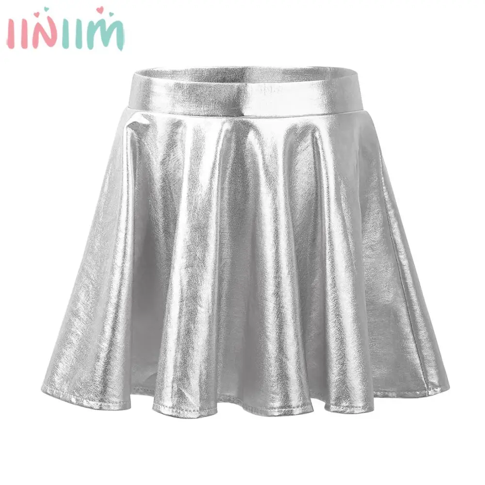 Детская Глянцевая металлическая расклешенная плиссированная трапециевидная мини-юбка для танцев Спортивная блестящая юбка скутер с высоким поясом
