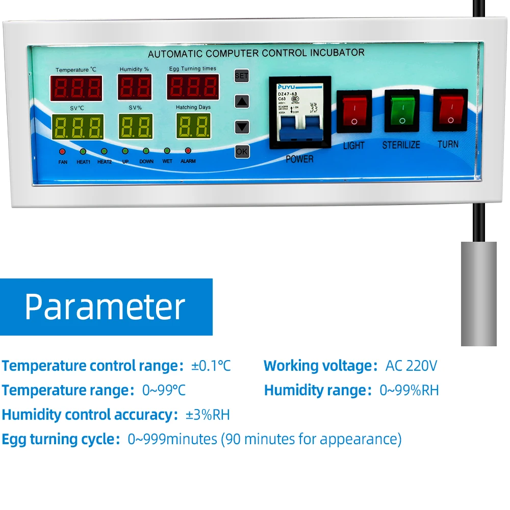 5. Количество сигнала-Выход: 7, (перегрев, контроль температуры, недостаточная температура, поворот яйца влево, поворот яйца вправо, контроль влажности, будильник)