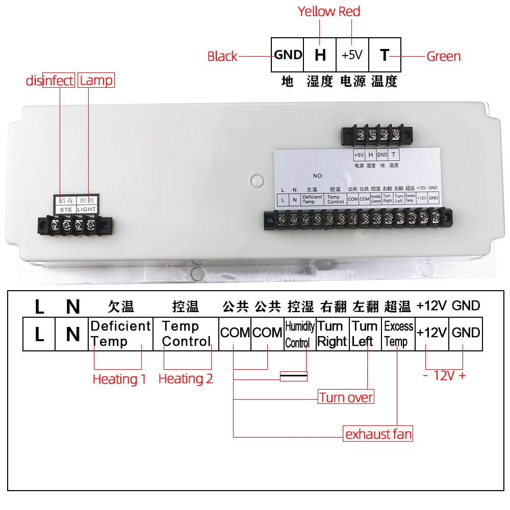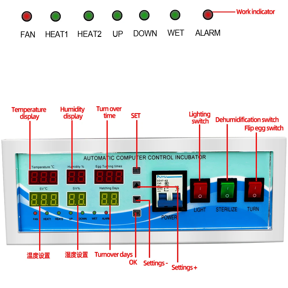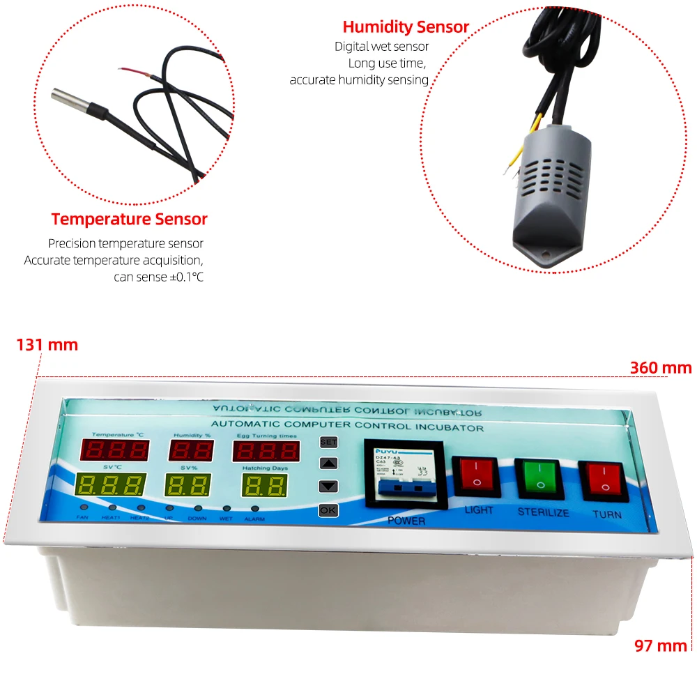 6. Максимальный выходной ток нагрузки: контроль температуры, недостаточная температура ≤ 8А/220В, перегрев, поворот яйца влево, поворот яйца вправо, контроль влажности, будильник ≤ 1А/AC220