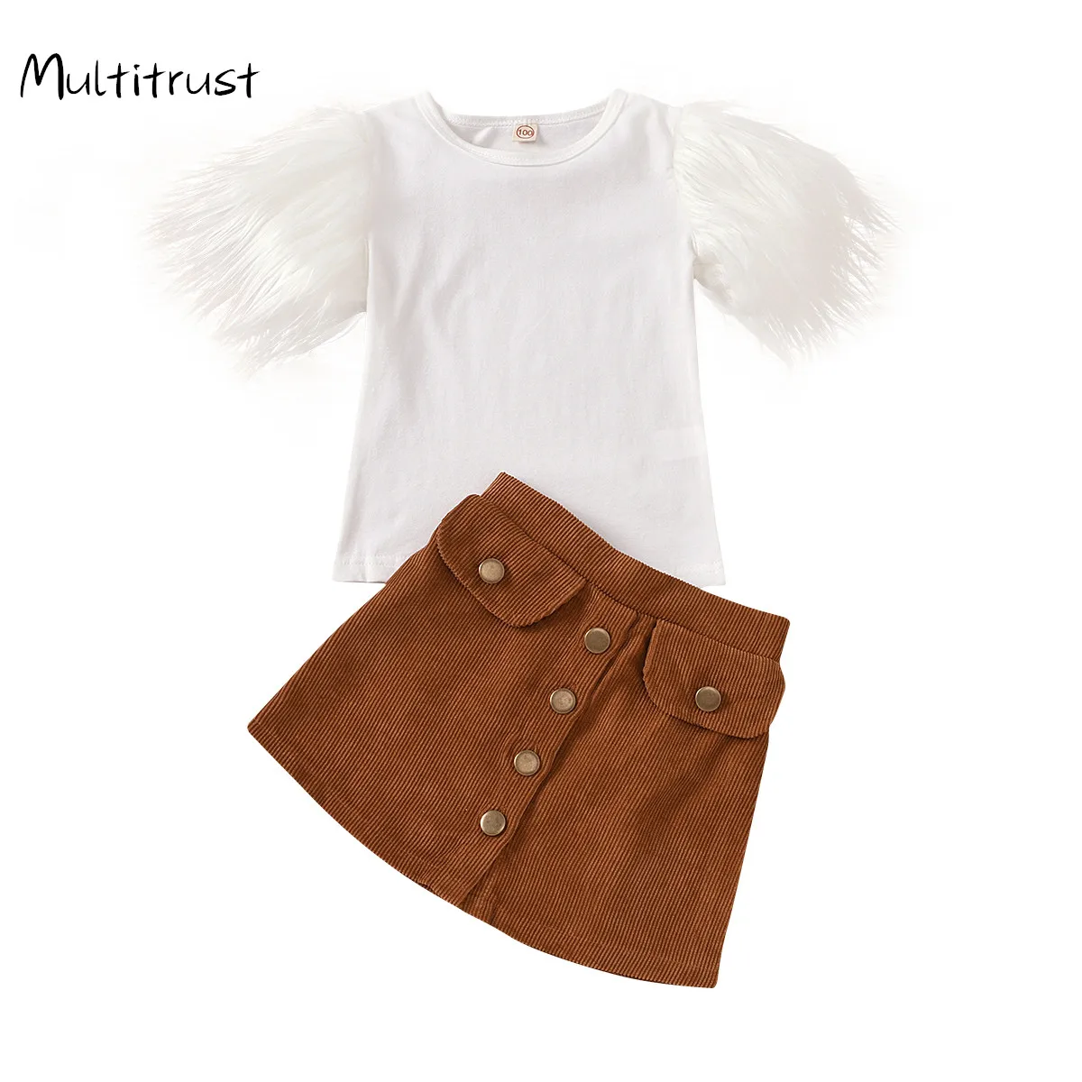 Эксклюзивная детская одежда От 2 до 8 лет Одежда для маленьких девочек топ с короткими рукавами и перьями + юбка трапециевидной формы осенняя одежда для девочек, 2 предмета, 2020