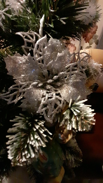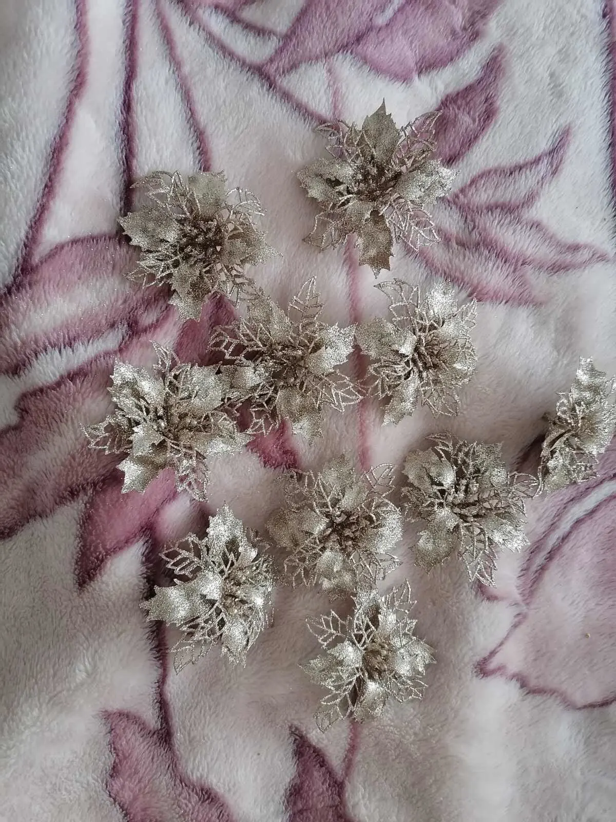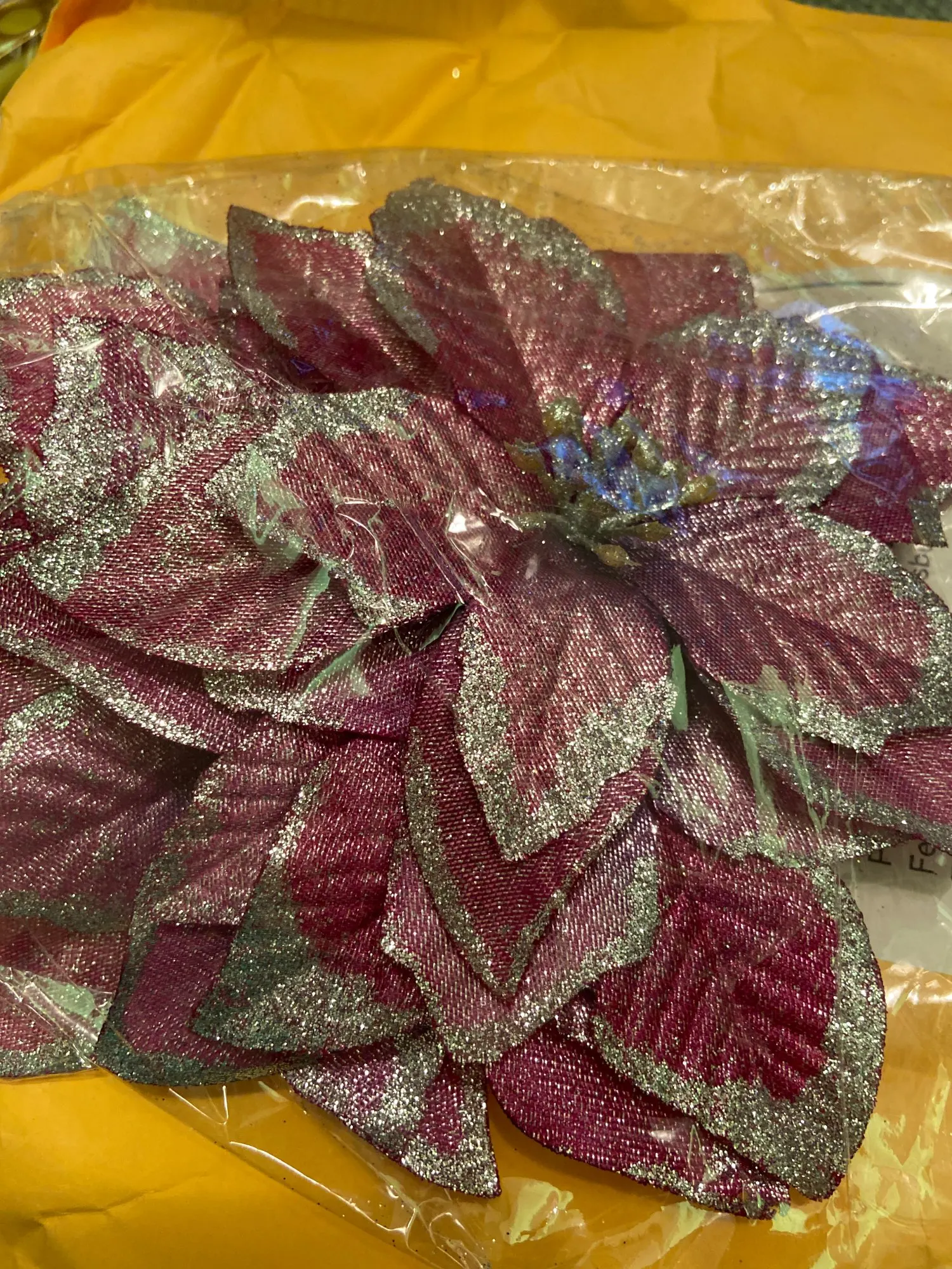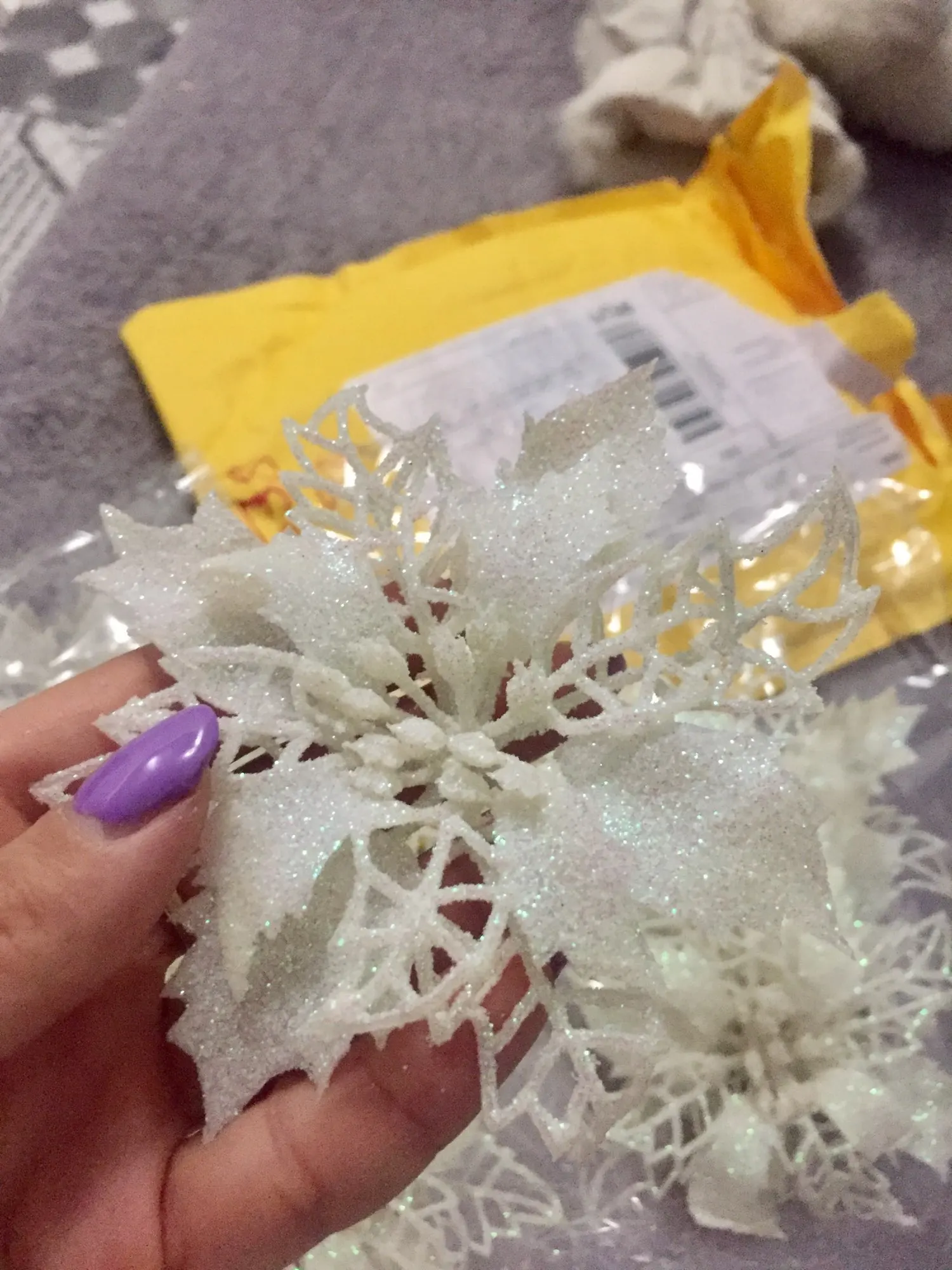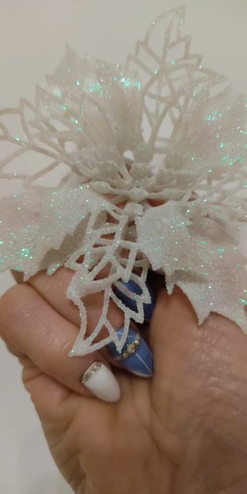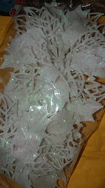 товар пришёл быстро, около 3 недель в Санкт-Петербург. цветы красивые, целые, только очень сыпятся блёстки! но на ёлке будут смотреться хорошо. один нюанс - нечем крепить их, только класть на ветку!