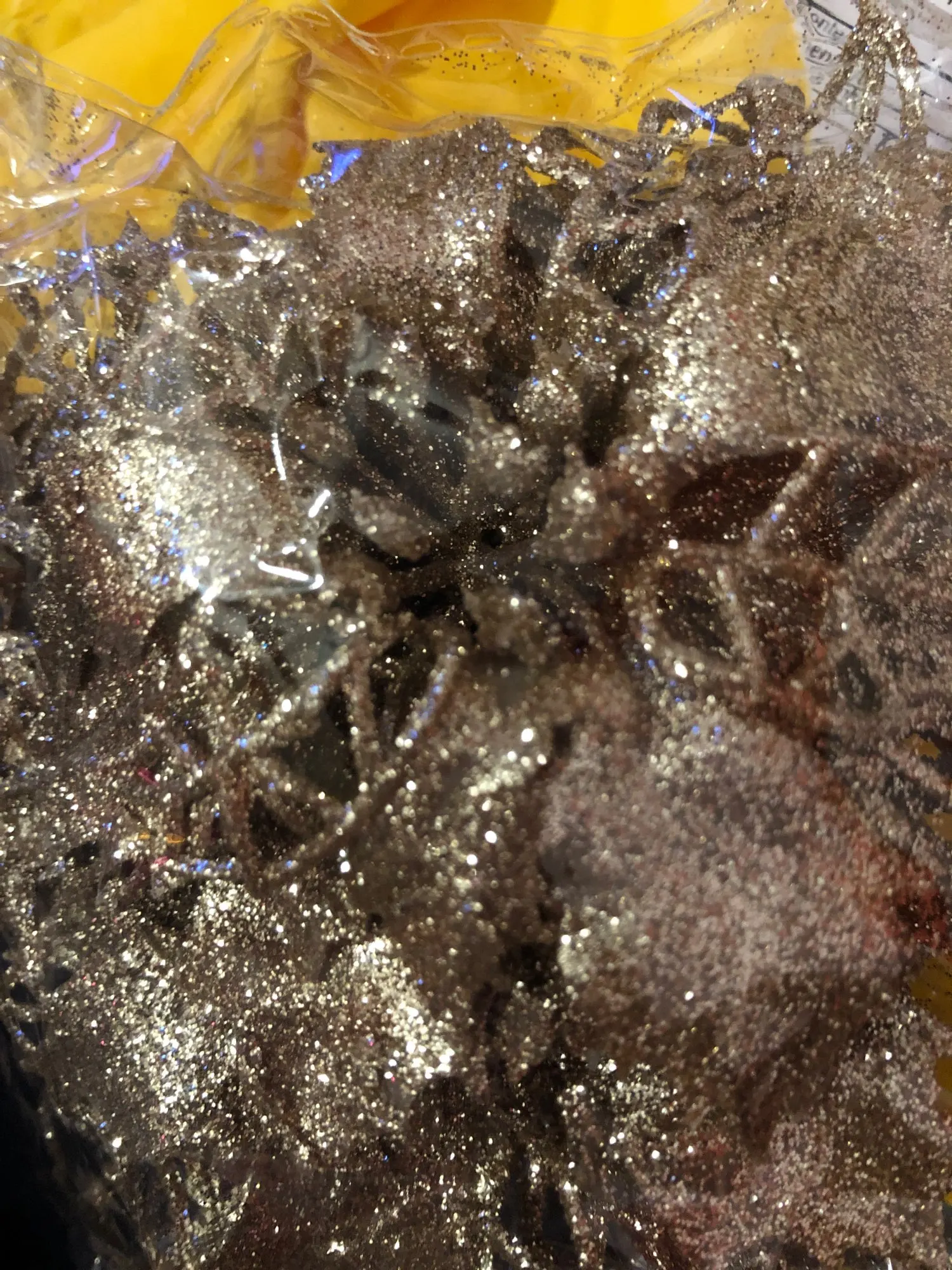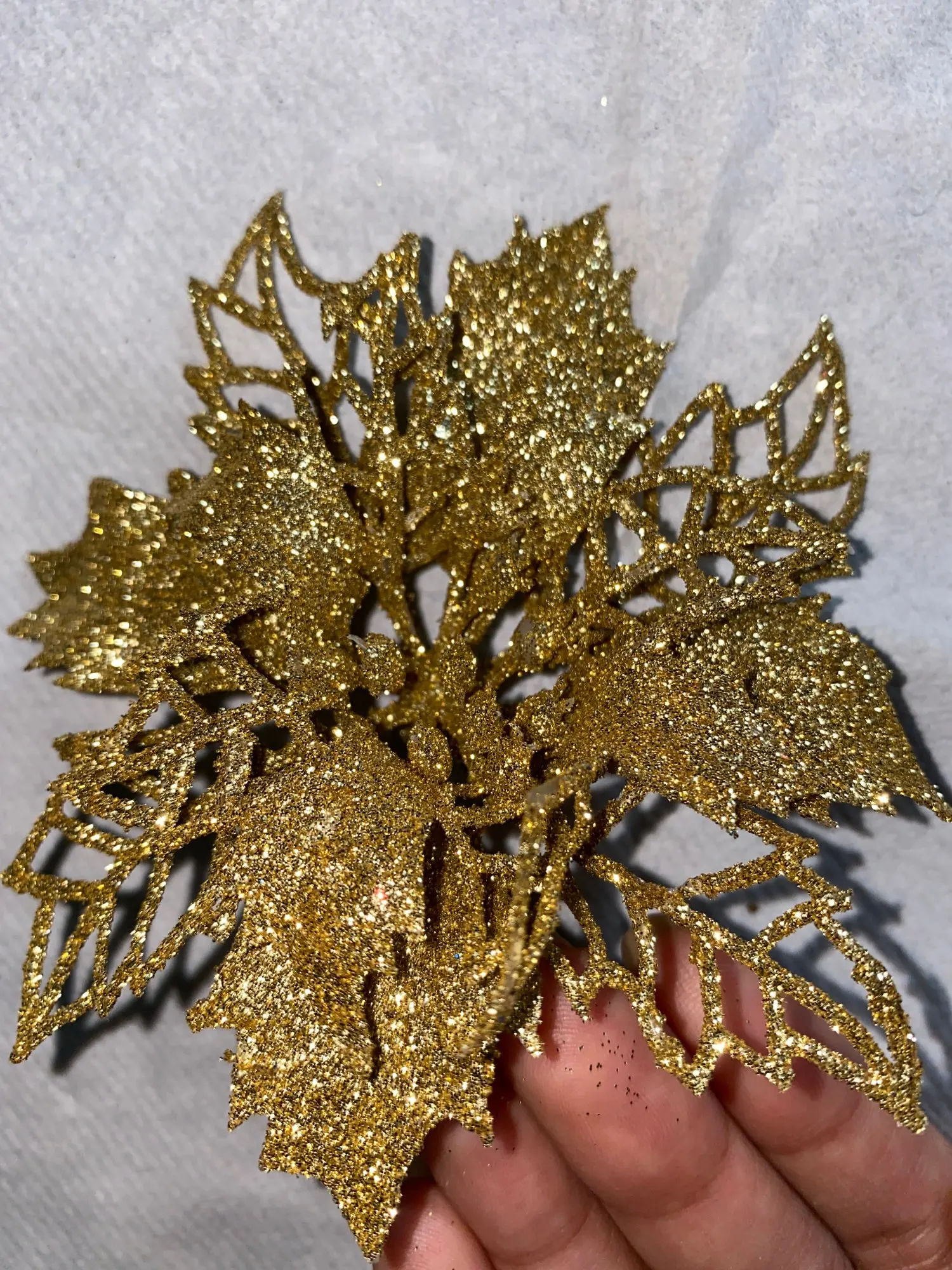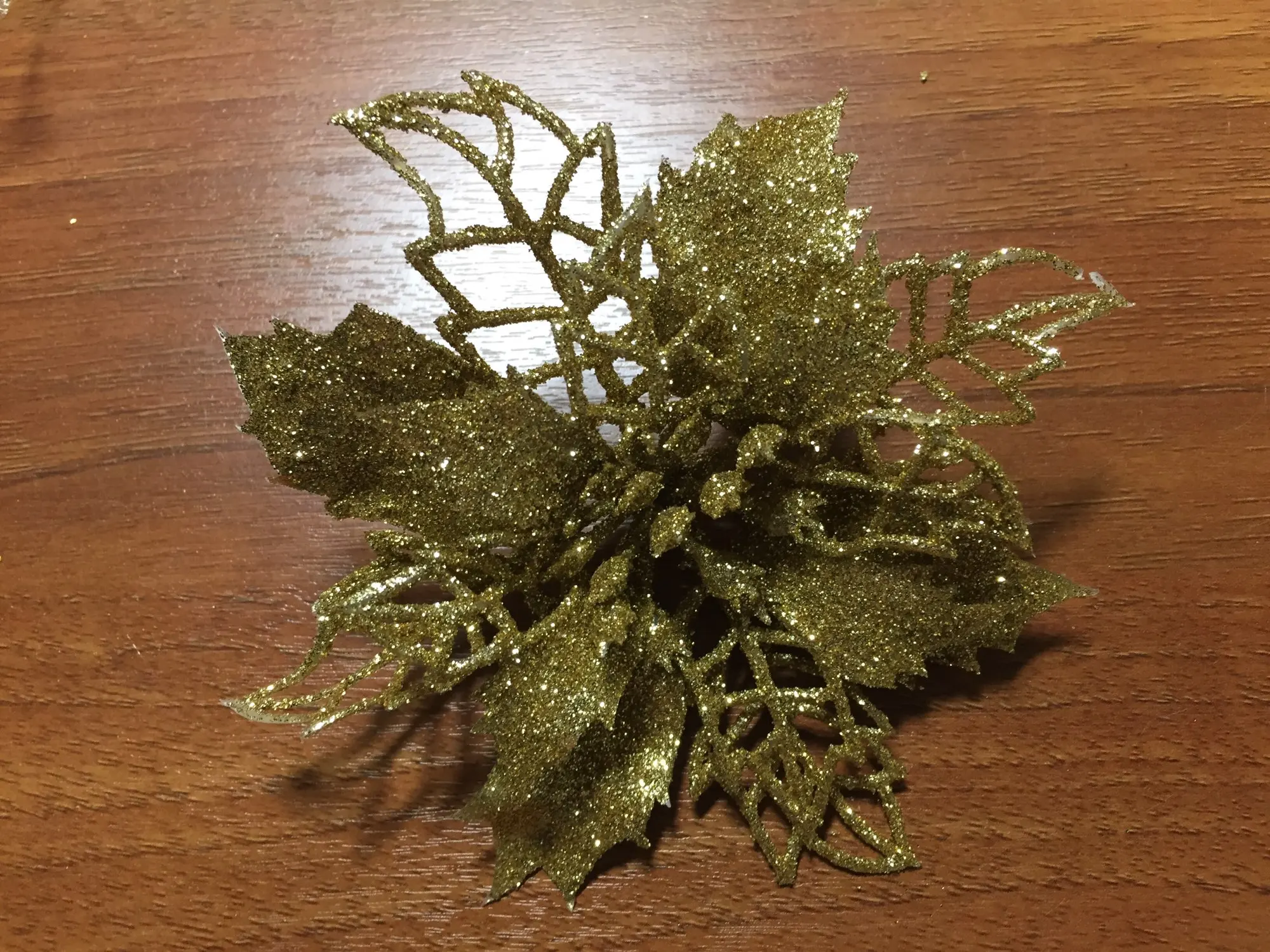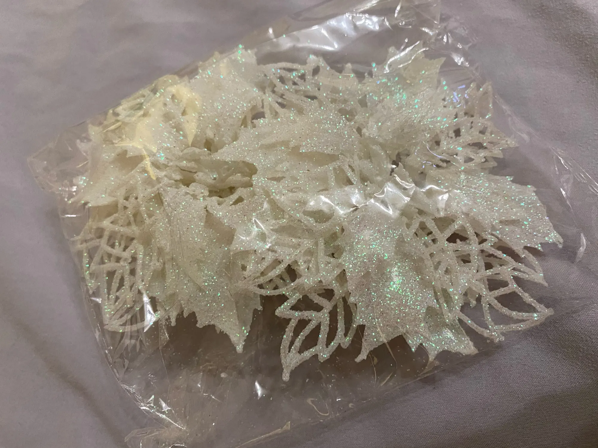товар пришёл быстро, около 3 недель в Санкт-Петербург. цветы красивые, целые, только очень сыпятся блёстки! но на ёлке будут смотреться хорошо. один нюанс - нечем крепить их, только класть на ветку!