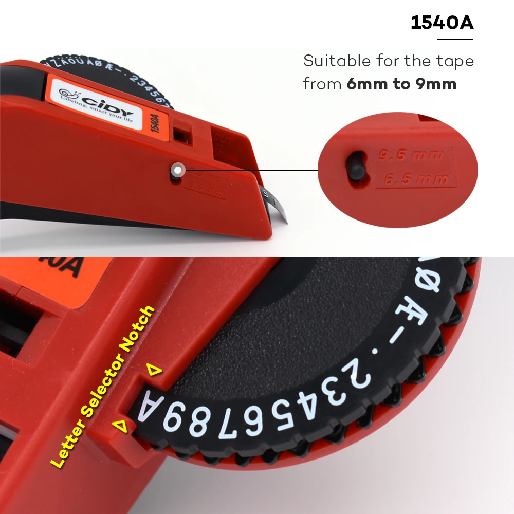 • Модель: CIDY 1540A/1540B производитель этикеток • Подходящая Ширина этикетки: 6 мм, 9 мм и 12 мм • Упаковочный лист: 1 машина с 1 черной этикеткой и 1 красной этикеткой