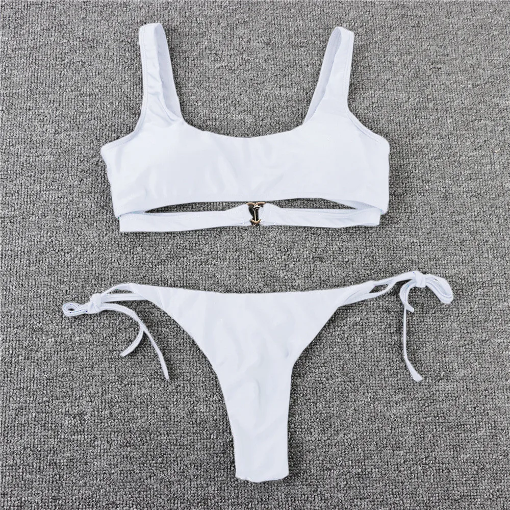 Однотонное бикини 2021, бандажный купальник, женский белый купальни...