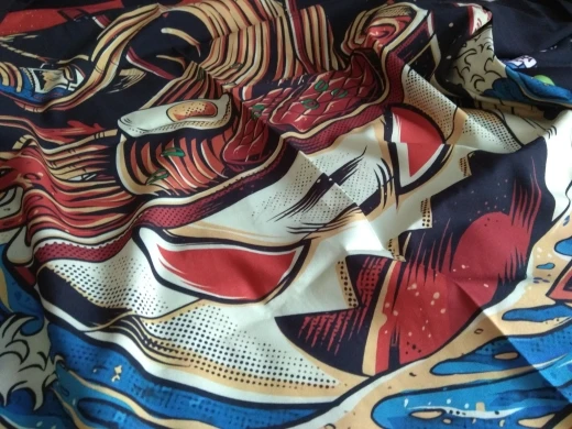 Пришло быстро, упаковано хорошо. Рисунок по цветам немного бледнее, чем кажется на фото, но пропечатан хорошо. Ткань приятная, нитки не торчат, смотрится круто.