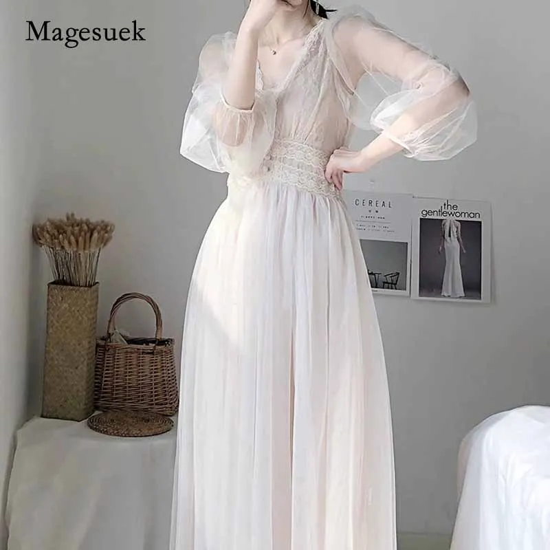 Женское шифоновое платье на пуговицах, элегантное белое однотонное ТРАПЕЦИЕВИДНОЕ ПЛАТЬЕ с пышными рукавами и V-образным вырезом, кружевная вуаль в стиле ампир, 2020, 8126