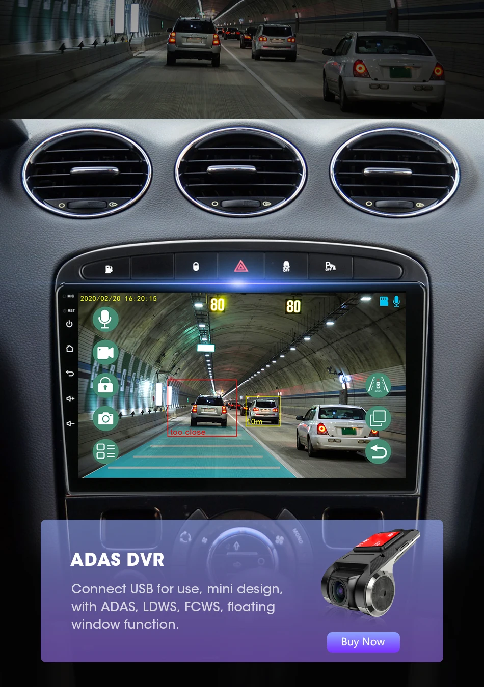 Поддерживает подключение к видеорегистраторУ ADAS. ADAS DVR имеет несколько встроенных ассистивных технологий вождения, вставляя высококачественную карту памяти TF для записи каждого момента вашего вождения.