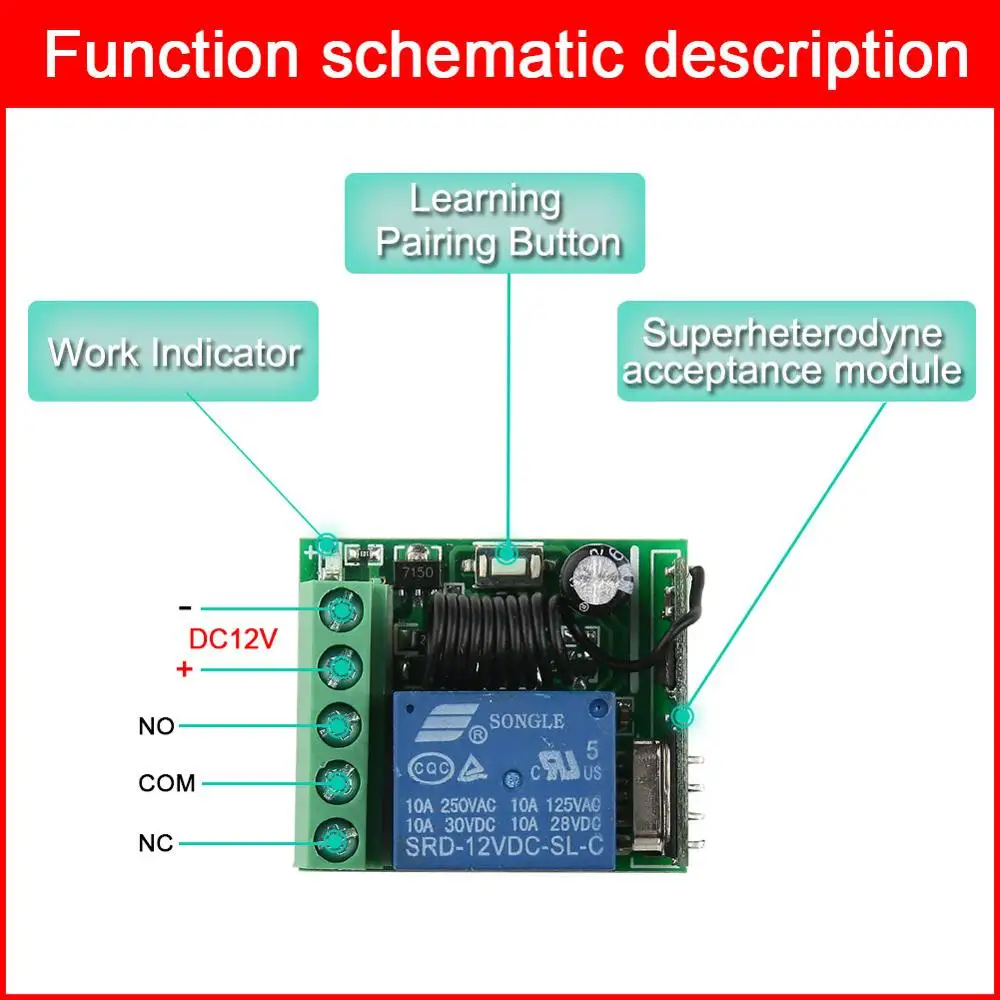Входная мощность: DC10V-14VТок в режиме ожидания:<5 мАЧастота RF: 433 мРежим работы RF: СупергетеродинЧувствительность приема: >98 дБмРасстояние передачи:>100 м (открытое пространство)Режим декодирования: программное декодирование MCUУдаленное Хранение: 30 шт.Поддержка удаленного типа: Обучающий код, фиксированный кодРежим работы: Мгновенный, переключение, задержка времени фиксации (10 с, 30 с, 90 с, 120 с)Тип проводки: фиксированная клеммаВыходной терминал: NO , NC , COMРазмеры печатной платы: 35*31*18 мм (Д, Ш, в) Récepteur Описание: