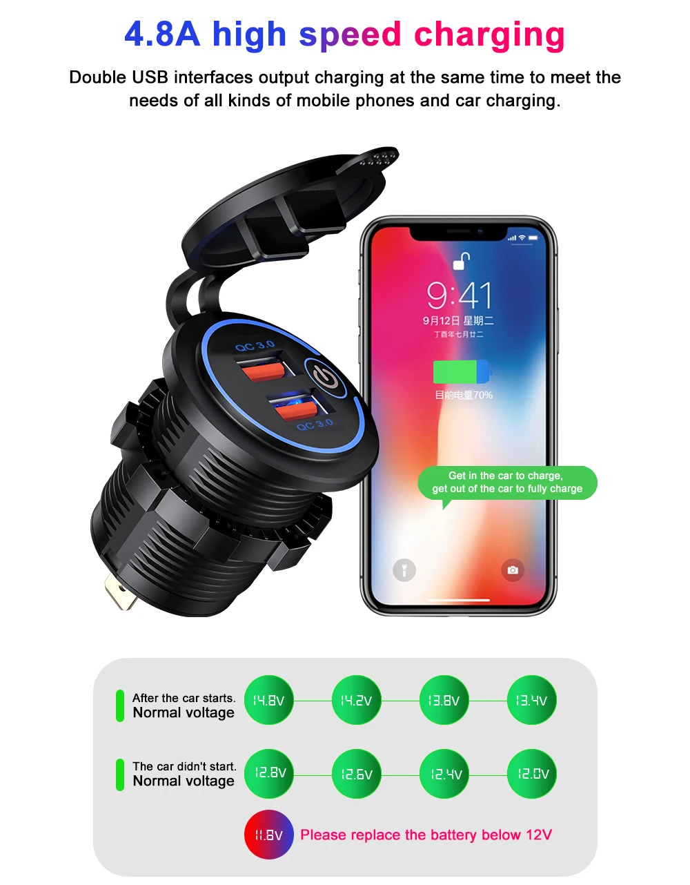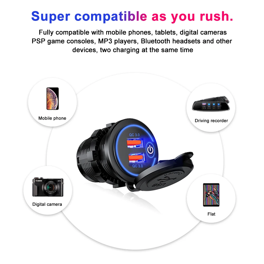 Зарядное устройство для прикуривателя, 12 В24 В, 36 Вт, QC 3,0, 2 USB разъема, сенсорный переключатель, водонепроницаемый, универсальный, для автомобиля, грузовика