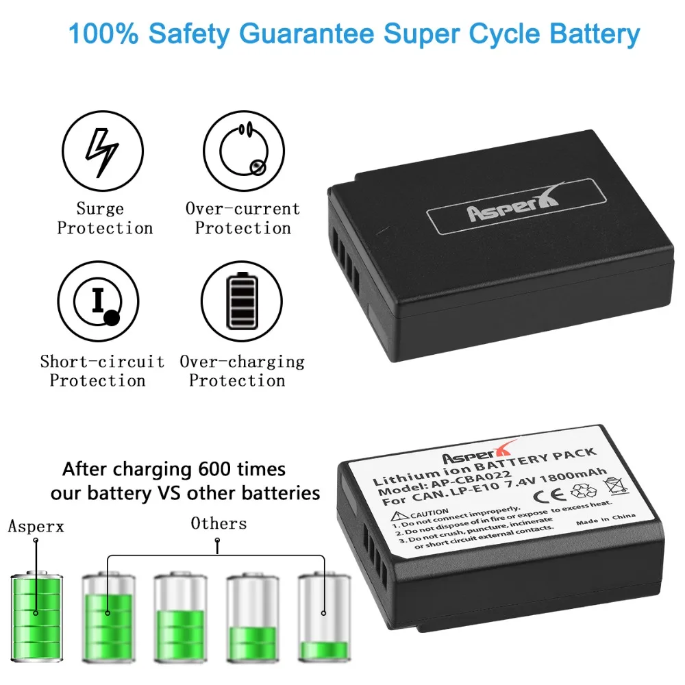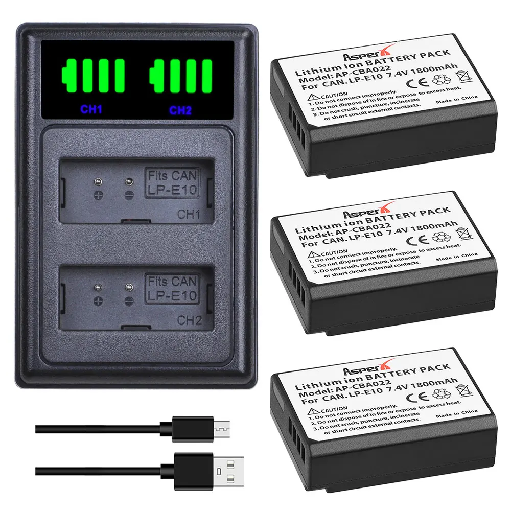 3x LP-E10 1800 мАч LPE10 батарея для Canon 1100D 1200D 1300D 2000D Kiss X50 X70 Rebel T3 T5 + двойное зарядное устройство с Type C
