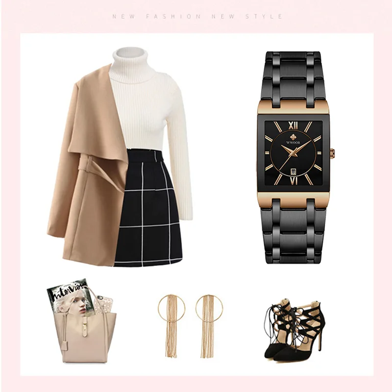Женские часы 2021 WWOOR, модные женские квадратные кварцевые часы, лучший бренд, Роскошные, розовые, черные, водонепроницаемые, с датой, женские часы