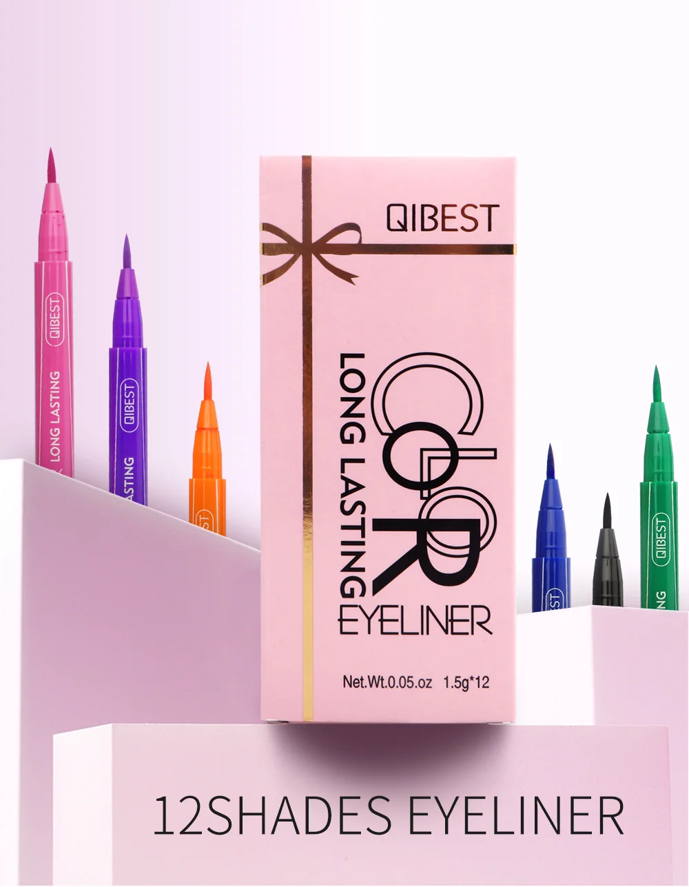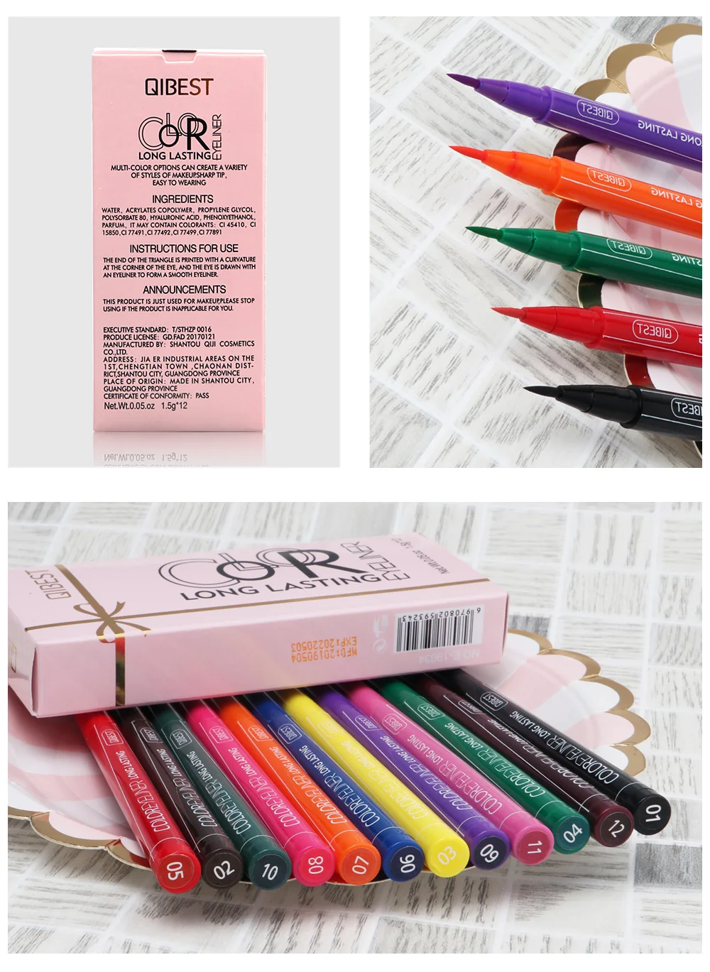 QIBEST цветная жидкая подводка для глаз, ручка, легкая в нанесении, стойкий макияж кошачий глаз, 12 цветов, Водостойкая Подводка для глаз, карандаш, косметика, макияж