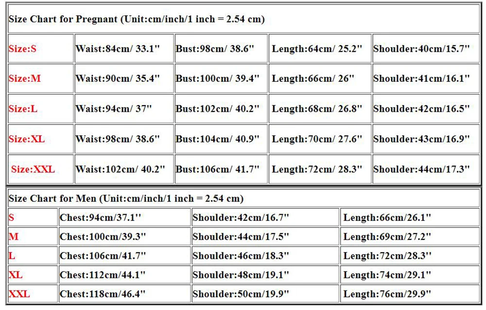 Размеры таблицей для беременных (единица измерения: см/дюйм/1 дюйм = 2,54 см)