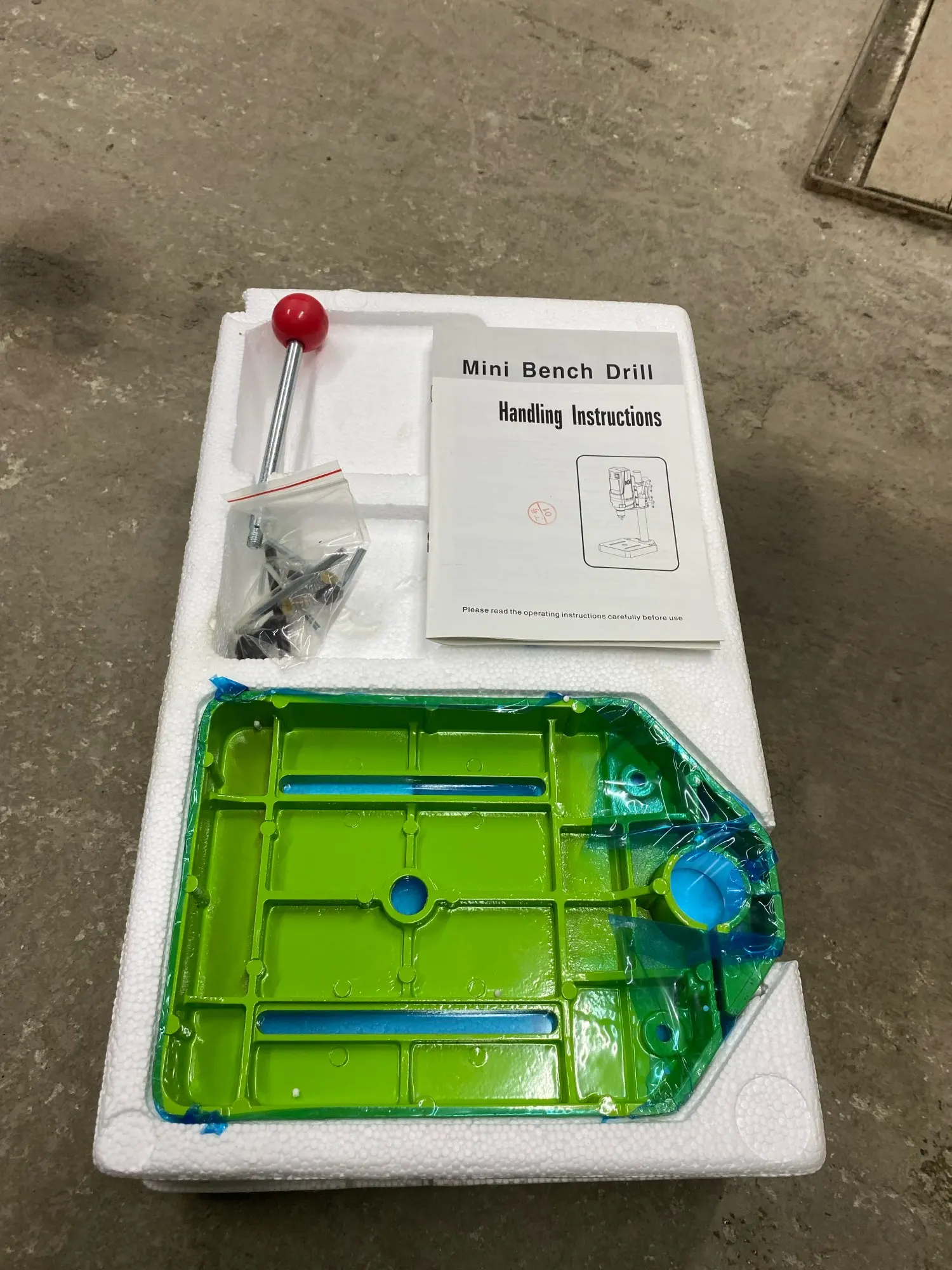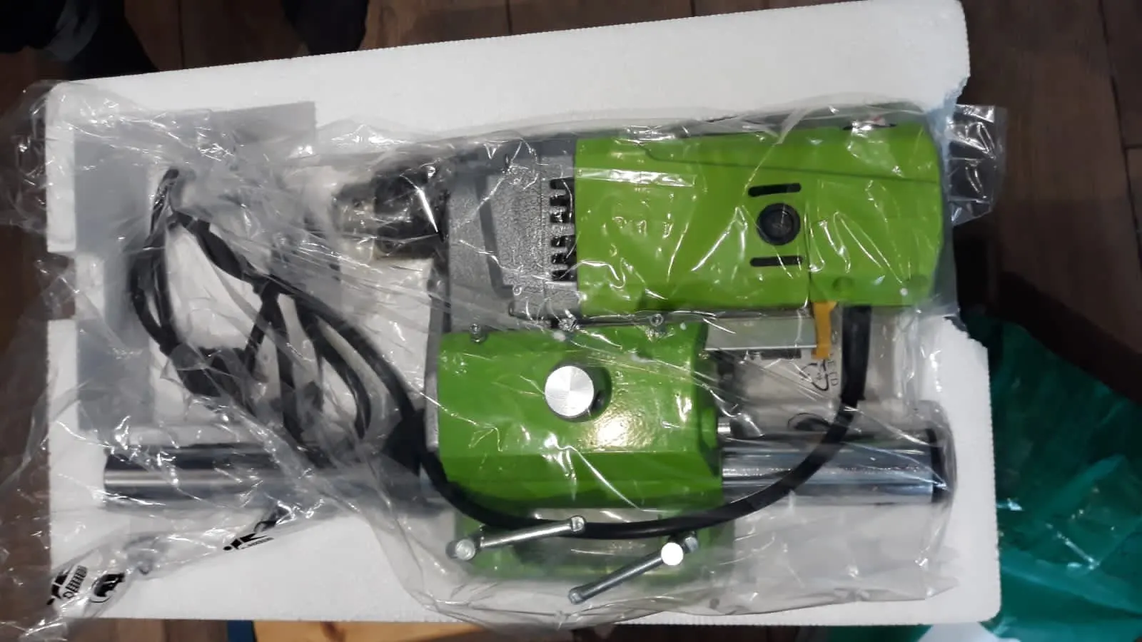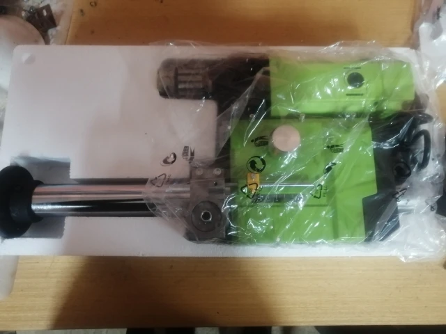 Доставили курьером на третий день. Увесистый. Станина тяжёлая, литая, в масле. Коробка имела замятости, пенопласт упаковки в труху... словно в футбол играли, но всё целое. В комплекте ключи (2 рожковых и 2 шестигранника), запасные щётки, инструкция (что там и на каком языке не знаю, заведомо знал что покупаю, информации про эти станки много как и обзоров включающих внутренности). Из косяков не влияющих на работу (возможно пока не столкнулся с проблемами) - слетел флажок указателя глубины сверления, есть гайка и нет винта, в коробке тоже не было. Есть болт аналогичный болтам крепления к станине. Откуда не понял. Со следами закручивания. Остальное вроде на месте. Чуть погоняю - допишу. Пока всё работает, жужжит, крутится, регулируется.