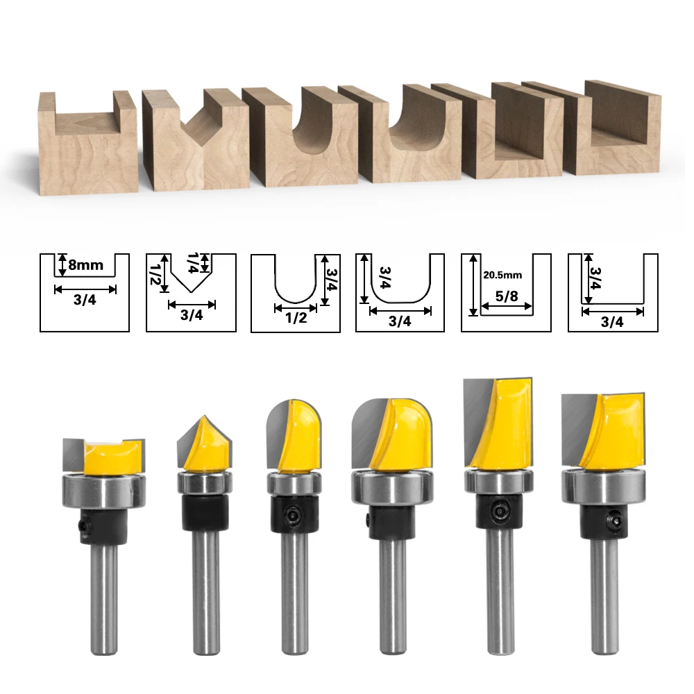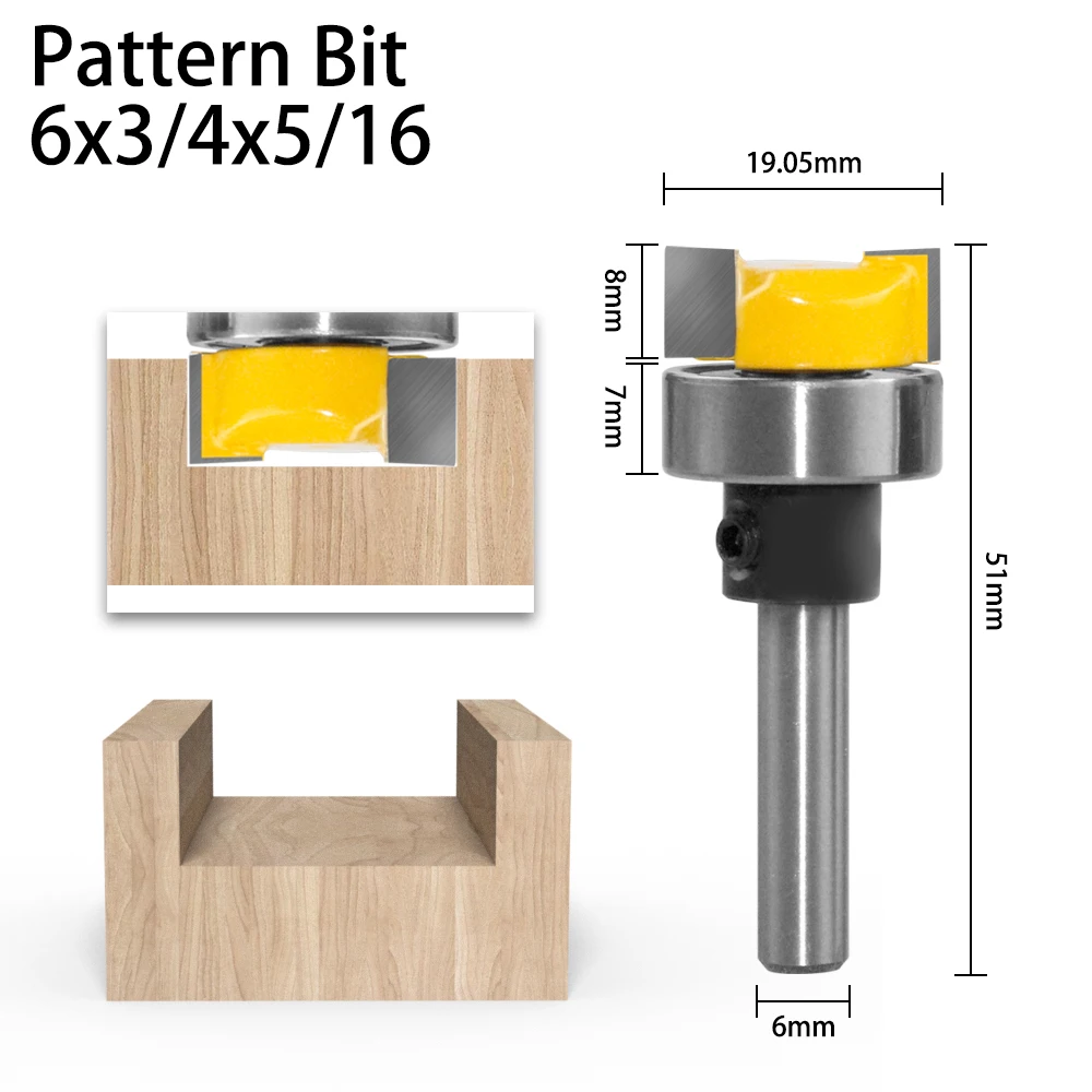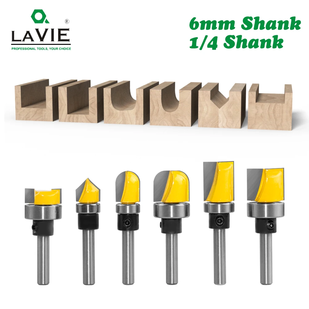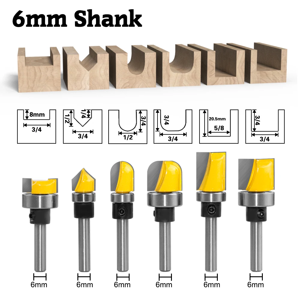6 шт. 14 "6 мм хвостовик шаблон бит заподлицо отделка бит прямой бит с подшипником шарнир Mortising маршрутизатор бит древесины триммер резак C06 C07