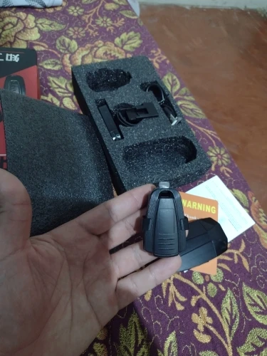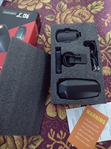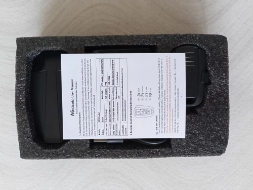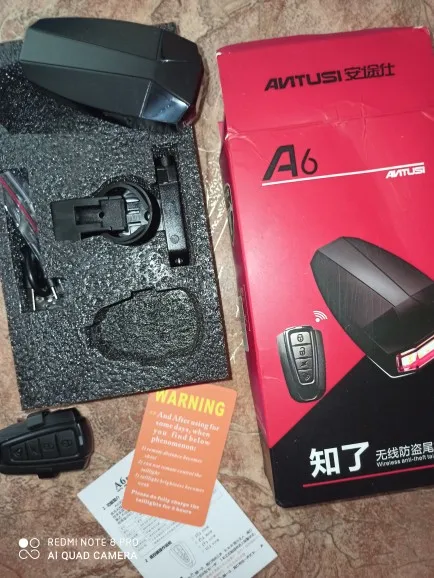 пришла посылка быстро,за 2 недели. хорошо упакована. внутри посылки коробка с сигнализацией и креплениями,шнур для зарядки. Есть описание на английском с рисунками.при нажатии пульта сработала сигнализация,значит заряжен.проверю полностью в деле дополню отзыв. продавец отзывчивый.
