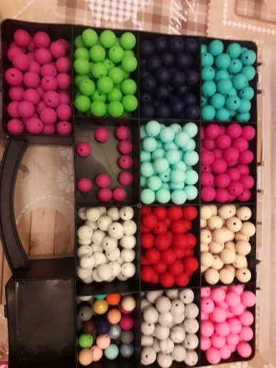 По 12 бусин лилового, кораллового, зеленого и оранжевого цвета и по 6 голубых и желтых бусин. Оранжевый мне к сожалению не очень понравился. Больше на темнобежевый похож. Лучше бы его положили меньше, а взамен голубые или желтые. Но в целом я довольна товаром.
