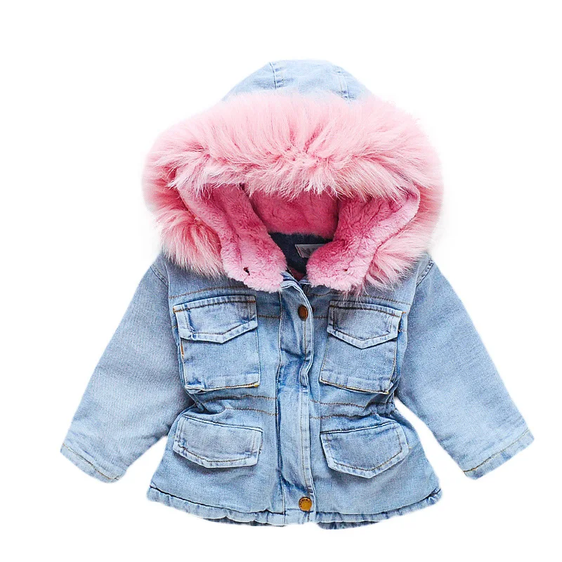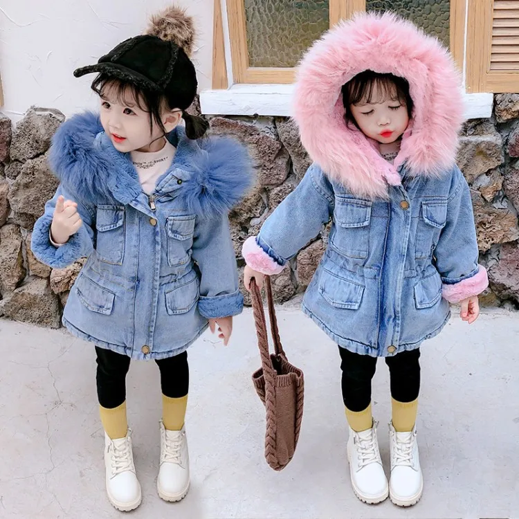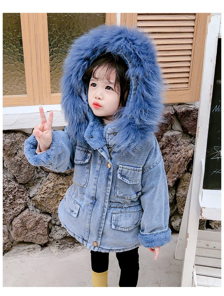 Куртка для девочек, зимняя, теплая, Джинсовая, с меховым воротником, с капюшоном