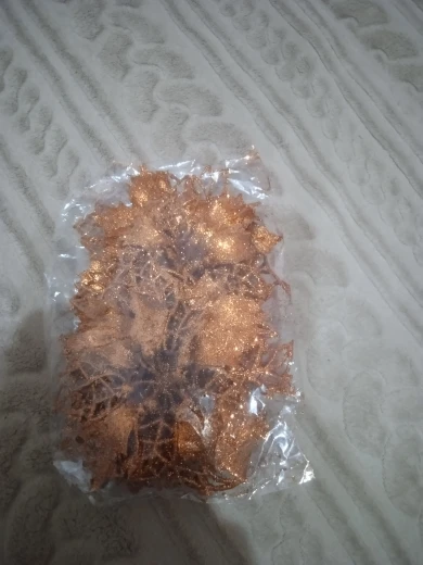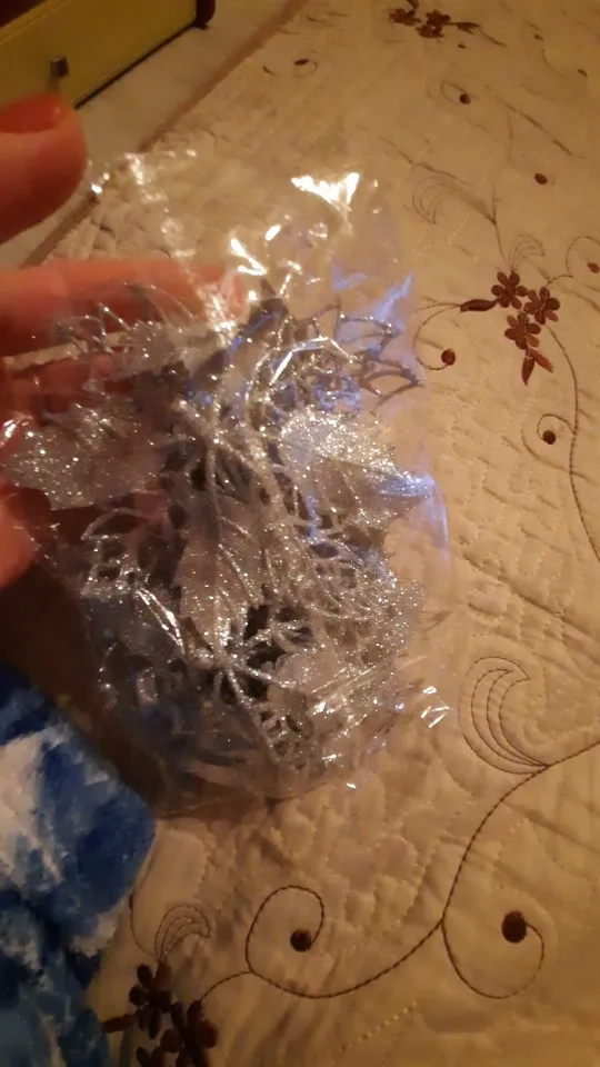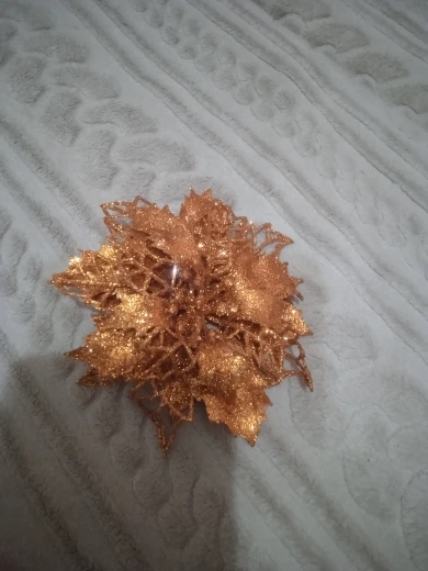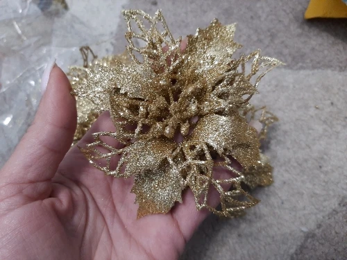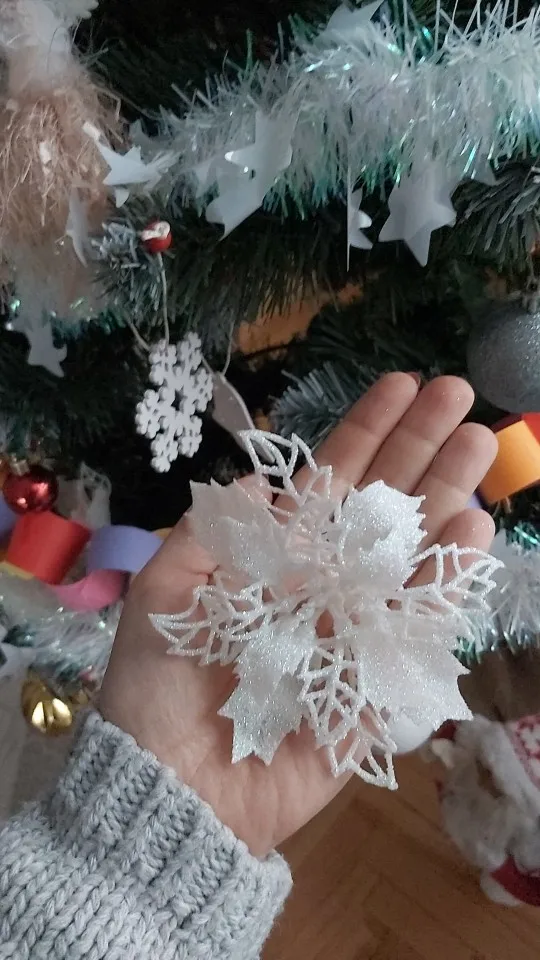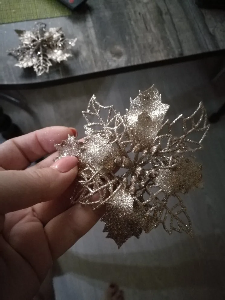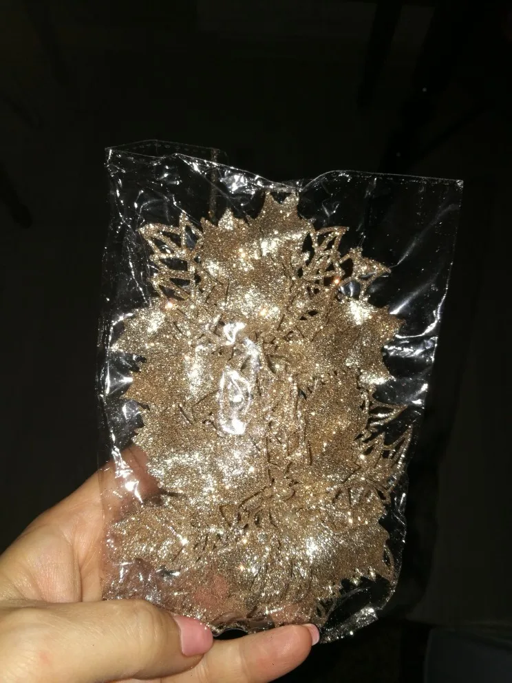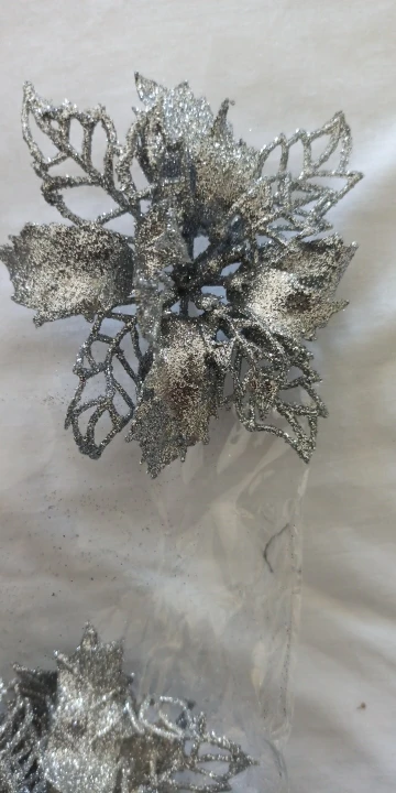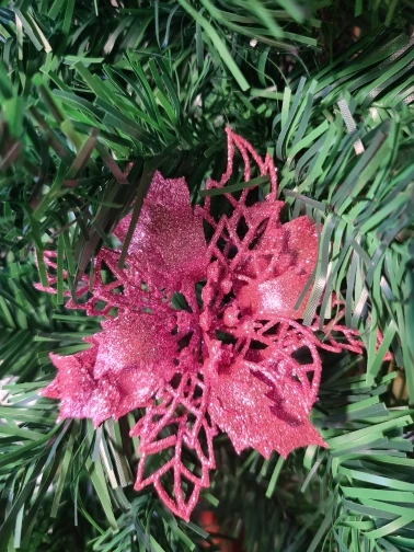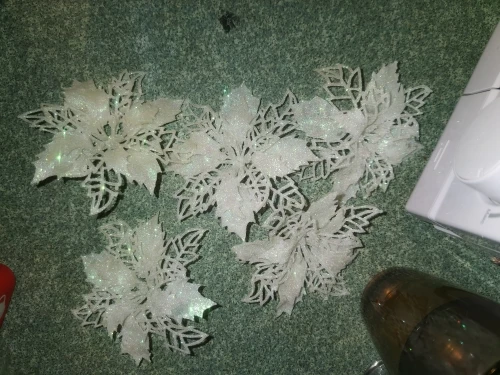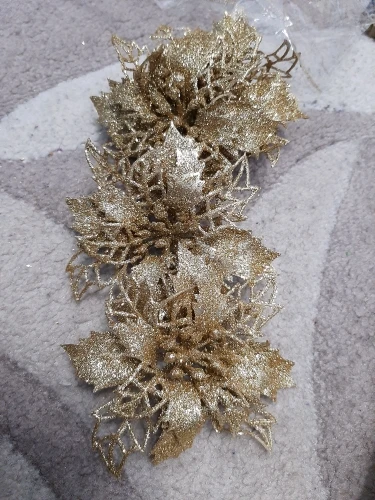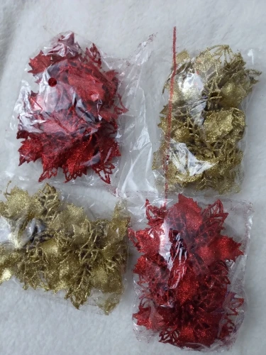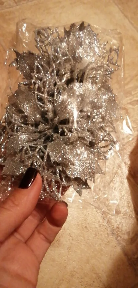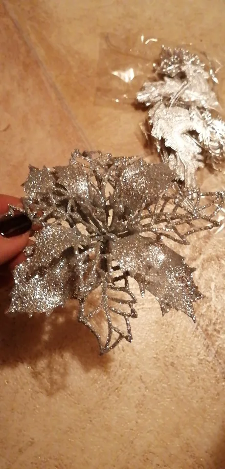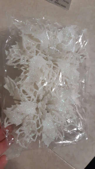 Вполне приличные цветочки. Да, блестинки с них естественно слегка сыплются, но критичного в этом ничего нет. Упакованы были просто в целофан. Слегка примялись, но я их не расправляла, просто положила на ёлку. Креплений никаких нет, для тех, у кого натуральная ёлка, само то! Единственное но...доставка заняла 2,5 месяца...ну безумно долго, еле успела посылка к новому году.