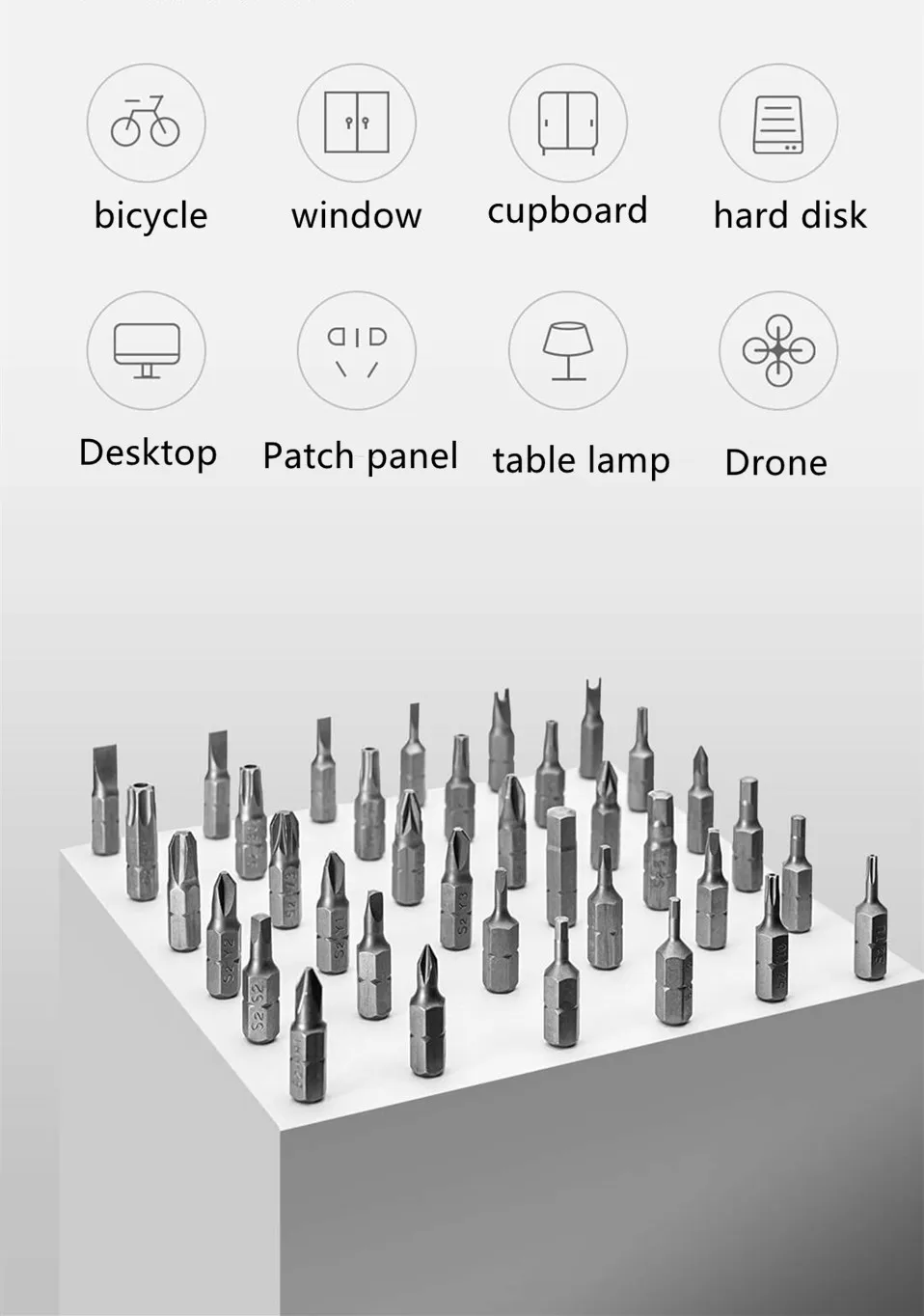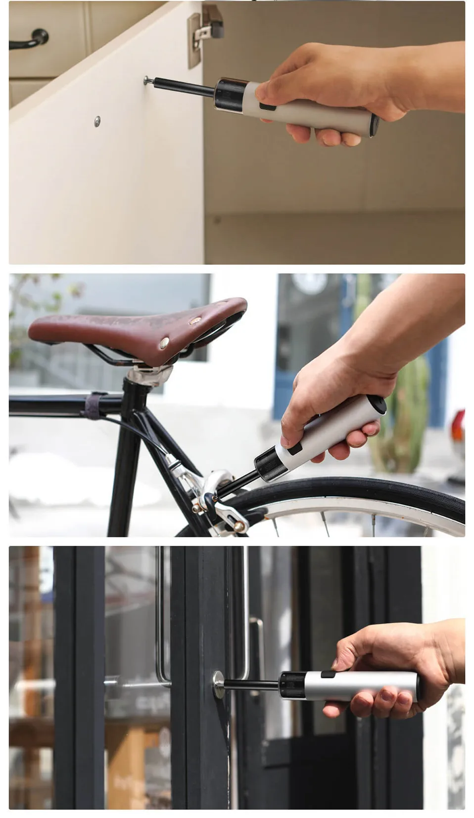 -Встроенная литиевая электроэнергия, Сверхдолгий режим ожидания-Тонкая ручка и короткая бархатная противоскользящая подкладка-нежная и удобная-Очень длинный67 мм выходной вал, Легко справиться с узкими условиями работы-Оснащен3 светодиодный светильник без тени, Не бойтесь тусклой окружающей среды-Он имеет различные размеры отверток, которые будут легко удовлетворить все ваши потребности, с жесткостью бит до60hrc. Он также оснащен36 различных головок отверткиДля обработки различных типов и размеров винтов.-Ручная Самостоятельная интеграция за пределами храповика. Безопаснее, не царапает винты, и не повредит запястье.-Оригинал"Зажим для картриджа"Винты для хранения, удобный доступ, попрощайтесь с грязью. Крышка вмещает до 12 сменных отверток, так что вы можете хранить ваши выбранные биты внутри.-С этим гладким и инновационнымЦельный дизайн, Вы не увидите винтов на поверхности, иАлюминиевый корпусПридает ему изысканный внешний вид.-Используя немецкую технологию качества и процесс анодирования яблока, рукоятка очень удобная, а также устойчивая к окрашиванию и коррозии. Внутренние Шестерни плотно закреплены и долговечны.-Эта отвертка используетЦельнометаллическая коробка передачКомпактный и мощный. Кручения до0.9н. МДля электрических и3N.MДля ручного использования.-Эта уникальная отвертка имеет только одну кнопку на всем корпусе. Вы можете начать сОдин кликИ управляйте направлением вращения без переключения кнопок.-Используется отверткаМагнитное всасываниеУстановка между битами и корпусом, так что дополнительные инструменты не требуются для установки. Просто поместите запасную головку инструмента близко к корпусу отвертки для завершения установки. Непрерывное всасывание гарантирует, что биты не ослабляются во время использования.-Применение: он используется для широкого спектра домашних задач, таких как Разборка и сборка небольшой мебели, столов и стульев, кроватей, шкафов, дверных ручек, различных типов ламп, выключателей и т. д.
