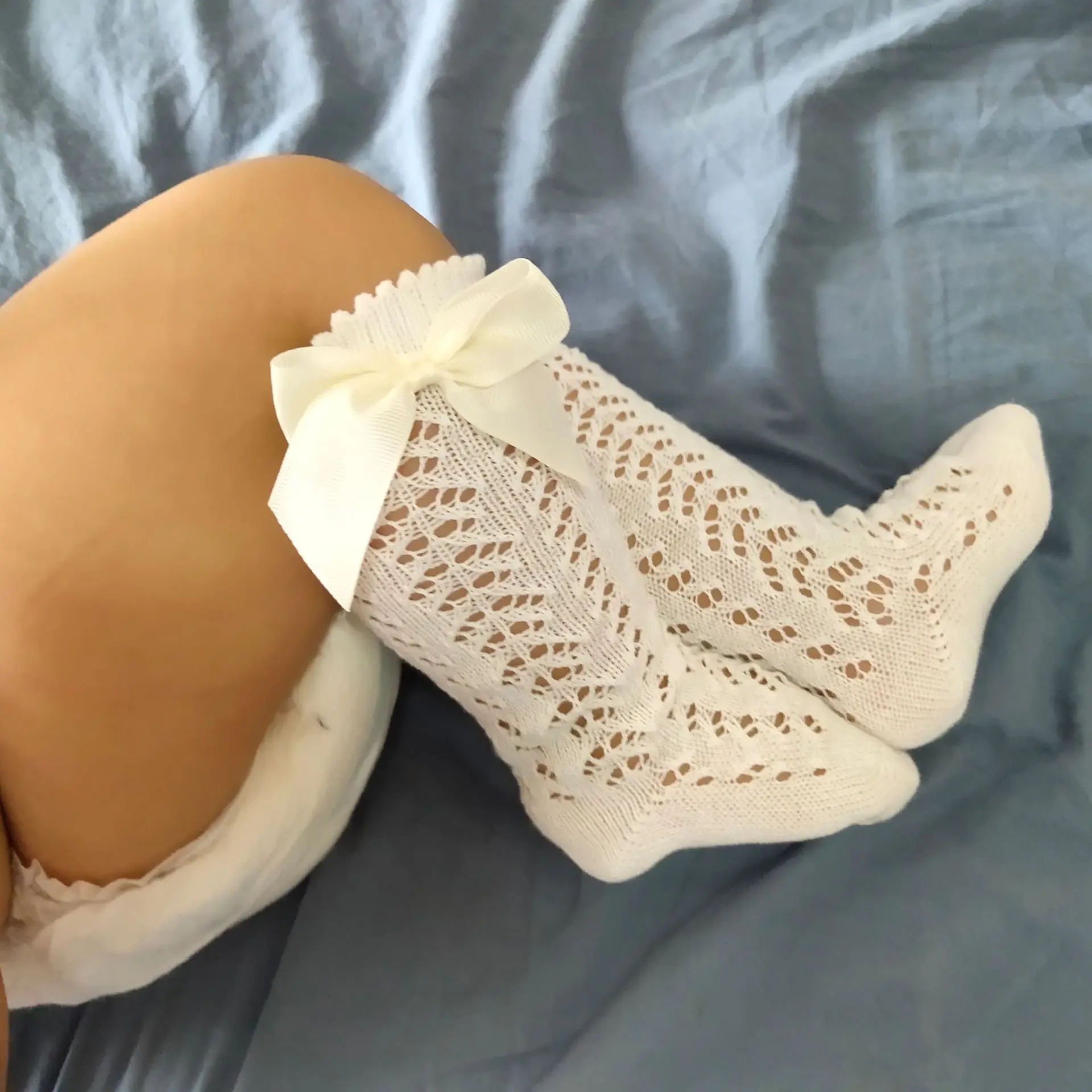 Детские вязаные носки с бантом на возраст 1-3 года, модные летние тонкие носки для девочек, носки для пола