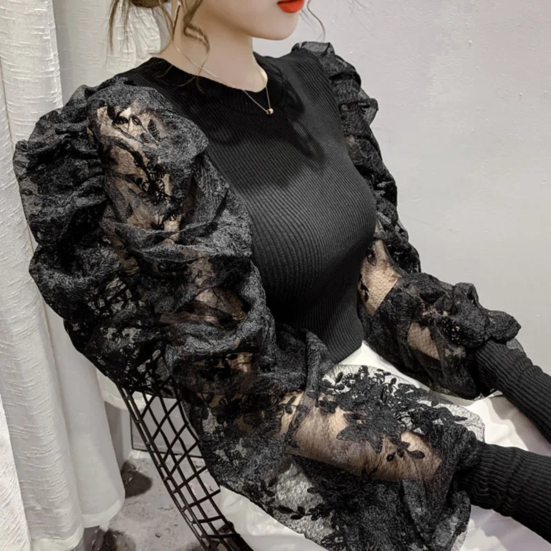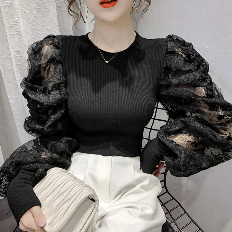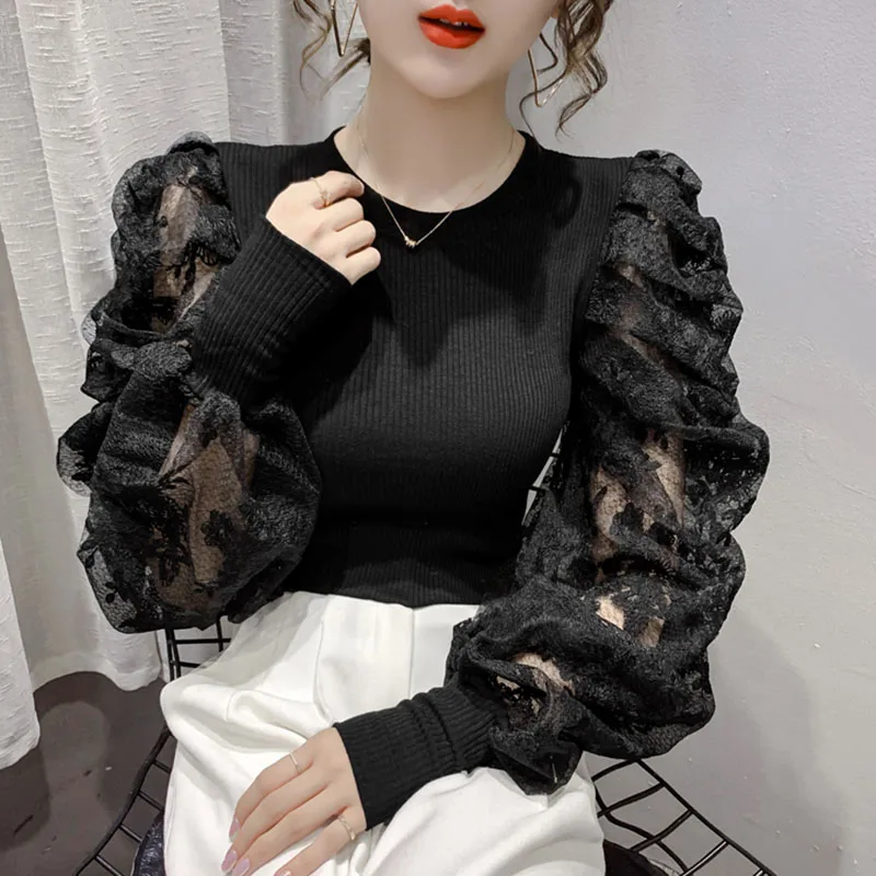 Женская блузка в европейском стиле, кружевной топ с рукавами-фонариками и отстрочкой, новинка, облегающие Женские топы с длинным рукавом, LL229, весна-осень