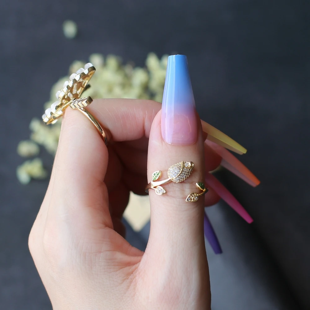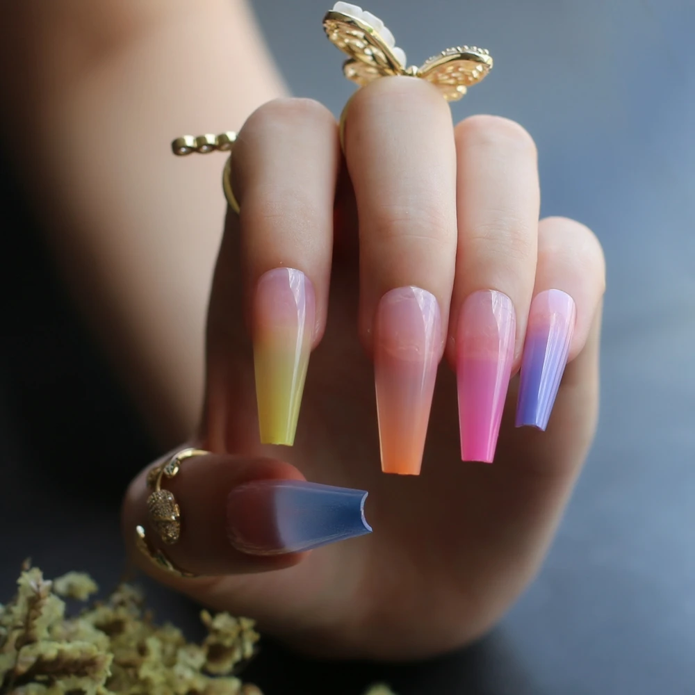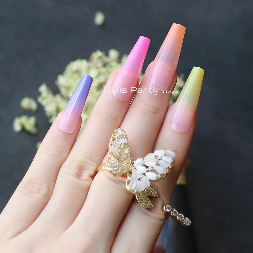Экстра-радужные ногти, длинный гроб, накладные ногти с эффектом омбре, роскошные накладные ногти
