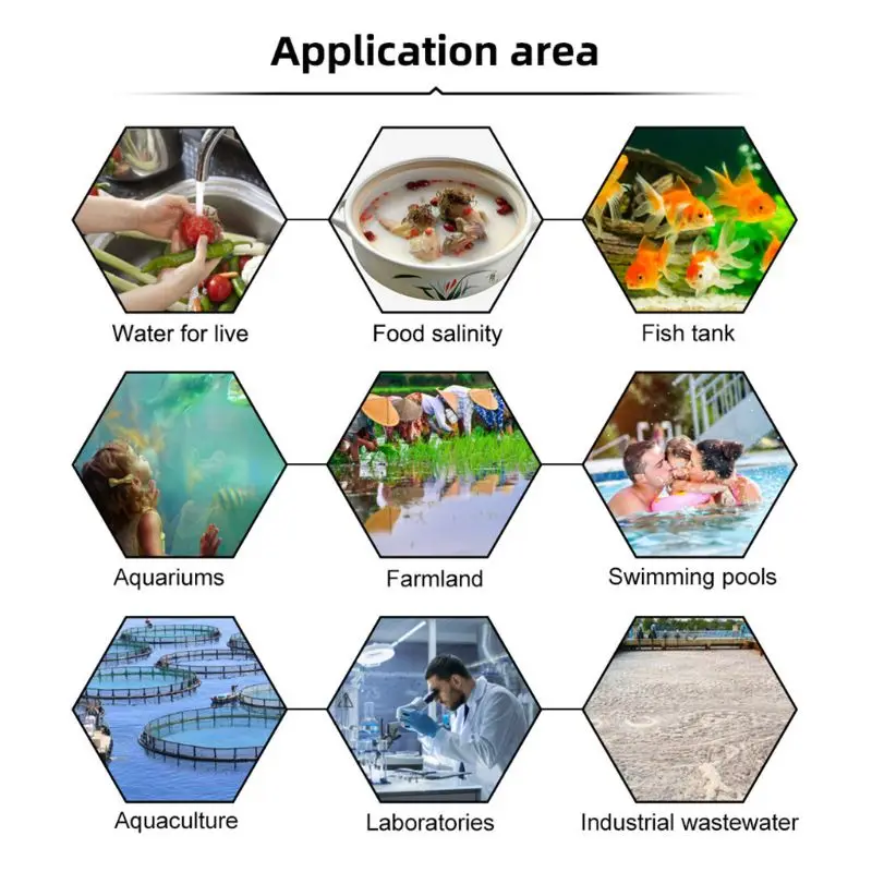 5 в 1 TDS/EC/Salinity/S.G./измеритель температуры цифровой тестер качества воды для дома, бассейнов, питьевой воды, аквариумаOOTDTYОписание:C-100 универсальность TDS портативный/EC/Соль/S.G/TEMP тестер качества воды.В основном используется для тестирования TDS (ppm/), EC (uS/cm, mS/cm), соли (%), S.G (гравитация морской воды) и температуры (°C/°F)Тип ручки простой и портативный. Поместите счетчик в раствор, он может быстро и стабильно отвечать на чтение и имеет функцию калибровки, чтобы обеспечить высокую точность.Диапазон измерений большой и широкий, который может измерять соленость пресной воды и морскую сольЭто удивительный цифровой тестер качества воды для дома, бассейнов, питьевой воды, аквариумовУпаковочный лист1*5 в 1 тестер качества воды1 * руководство на английском языкеСпецификацияEC:Диапазон: от 0 до 10000uS/см 10,01-19,99 мс 20,1-400 мс/смРазрешение: 1uS/см; 0,1 ms/cm;Точность: ± 2% Ф. С.TDS:Диапазон: от 0 до 1000ppm 1000ppm до 10000ppm 10,1 для 200.0ppt (автоматически вне допустимого диапазона)Разрешение: 1ppm; 0,1 pointТочность: ± 2% Ф. С.Соленость:Диапазон: 0,00 до 25.00%Разрешение: 0.01%Точность: 0,01-5.00% (± 0.1%) 5,10-25.00% (± 1%)SG: 1,000-1,222Калибровка: EC: дополнительная Трехточечная калибровка (1413uS 12,88 mS 111,8 mS)Компенсация температуры: ATCРабочая среда: от 0 до 80,0 °C (32,0-176f); <>Коэффициент TDS: 0,5Диапазон температур: 0,1-80,0 °C 32,0-176 °FТемпература точность: + 0,5 °CРазрешение температуры: 0,1 °C/°FАвтоматическое выключение: 5 минутМощность: 3x1,5 LR44Размер экрана: 28*17 ммРазмер/вес: 159*34*16 мм (6,31*1,3 * 0.6in)/60 г (2,1 oz)Дисплей: поддержка подсветкиБатарея: индикатор низкого заряда батареиУстранение неполадокВключение, но без дисплея1. Батарея не установлена или батарея Низкая или неправильно установлена;2. Не нажимайте кнопку питания правильно;Решение:1. Извлеките батарейный блок, переустановите аккумулятор или замените новый аккумулятор;2. Проверьте правильность положительных и отрицательных полюсов аккумулятора;3. Вышеуказанные методы верны, инструмент не может быть открыт, пожалуйста, вернитесь на завод или агент.Нестабильное чтение1. Пузырьки воздуха вокруг электрода будут серьезно влиять на чтение. Чтобы уменьшить пузырьки воздуха, полностью погрузите электрод и качайте его в воздух, чтобы устранить пузырьки воздуха;2. Решение может быть асимметричным, что приводит к нестабильным показаниям;3. Зонд не погружен достаточно глубоко в раствор;4. Зонд сломан;5. Измерение помех окружающей среды.Многофункциональный тестер качества воды C-100Режим работы1. Нажмите Вкл/Выкл, включите счетчик, снимите защитную крышку, положите ее в раствор, который будет протестирован, и не погружайте ее выше линии погружения. Затем аккуратно встряхните его несколько раз в воде, чтобы устранить пузырьки вокруг электрода, и прочитайте правильное значение измерения после того, как значение будет стабильным2. Нажмите MODE/CAL для ввода различных моделей. Единица TDS составляет PPM или PPT, единица EC-США или mS, единица соли-%, а единица удельного веса морской воды-S.G.3. Нажмите «удерживайте»/«Темп», он будет отображаться в левом верхнем углу экрана, указав, что значение удерживается, затем удалите счетчик из раствора и прочитайте значение, нажмите кнопку HOLD / TEMP снова, чтобы выйти из режима hold.4. Удерживайте/температура в течение длительного времени, экран будет переключаться между °C и °FКалибровкаПосле длительного использования, вам нужно откалибровать. Поместите его в Стандартное решение, 