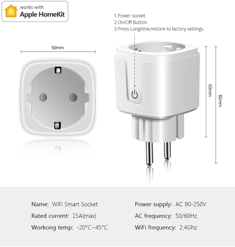 1. Спецификация Tuya:Тип: Wifi Smart PlugТип вилки: стандарт США/ЕСНоминальное напряжение: 90-250 В переменного токаМаксимальный ток нагрузки:Тип ЕС 16А; Тип США 10АМаксимальная мощность:Тип ЕС: 3680 ВтТип США: 2200 ВтWi-Fi частота: Wi-Fi 2,4 ГГцСистема поддержки: Android /IOSМодель управления: ручное управление/переключатель управления WIFIНазвание приложения: Tuya или Smart LifeОсобенности:【Дистанционное управление 】 даже если вы не дома, вы можете управлять смарт-вилкой вкл/выкл с помощью телефона через приложение Tuya или smart Life. Функция обратного отсчета Smart Plug позволяет установить таймер, который автоматически отключается, так что вы никогда не сможете задаться вопросом, отключено ли ваше устройство.【Голосовое управление 】 умная вилка работает с Alexa, Google Assistant поддерживает устройства для легкого голосового управления.【Установить планировщик 】 включить и выключить подключенные устройства в определенные сроки. Планируйте, чтобы вентилятор гостиной включался утром или планируйте выключить лампу вашего ребенка, чтобы сообщить, что это время сна.【Экономьте потребление энергии и электричество billпросмотрите энергетические отчеты, чтобы правильно отслеживать использование энергии вокруг вашего дома. Узнайте, какие устройства потребляют больше энергии, и создайте графики для экономии энергии и электрических счетов.Советы -- приложение:Будьте уверены в том, что вы используете 2,4 ГГц Wi-Fi при подключении к smart plug. И Wi-Fi должен быть обнаружен статус. Многие роутеры имеют сеть 5 ГГц и 4 ГГц, и ваш телефон всегда будет автоматически подключаться к сети 5 ГГц. Таким образом, вы должны полностью отключить свою сеть 5 ГГц, перейдя к настройкам маршрутизатора (введите ip-адрес маршрутизатора в Ваш Интернет-браузер, как правило, что-то похожее на 192.168.1.1), заставляет ваш телефон подключаться к сети 4 ГГц.Кроме того, режим шифрования маршрутизатора должен быть WPA2-PSK типом, а тип аутентификации должен быть AES.2. Спецификация Homekit:Название: интеллектуальная розетка с дистанционным управлением Wi-FiТип вилки: стандарт ЕСНоминальное напряжение: 90-250 В переменного токаМаксимальный ток нагрузки: 15аМаксимальная мощность: 3750 ВтWi-Fi частота: Wi-Fi 2,4 ГГцСистема поддержки: IOSМодель управления: ручное управление/переключатель управления WIFIНазвание приложения: Apple HomekitХарактеристика:A) не требуется концентратор для настройки: немедленно Начните управлять гнездом с помощью быстрой и легкой настройки с помощью wifi на совместимом устройстве Apple iOS с приложением Apple Home.Б) Голосовое управление с Siri: Управляйте гнездом с помощью голосовой интеграции через Siri попросите Siri включить или выключить, и многое другое.D) он работает с Apple HomeKit, поэтому вы можете легко управлять подключенными лампами с помощью Siri на вашем iPhone, iPad, iPod touch или Apple Watch. Не требуется устанавливать другие приложения.Советы -- приложениеБудьте уверены в том, что вы используете 2,4 ГГц Wi-Fi при подключении к смарт-лампы. И Wi-Fi должен быть обнаружен статус. Многие роутеры имеют сеть 5 ГГц и 4 ГГц, и ваш телефон всегда будет автоматически подключаться к сети 5 ГГц. Таким образом, вы должны полностью отключить свою сеть 5 ГГц, перейдя к настройкам маршрутизатора (введите ip-адрес маршрутизатора в Ваш Интернет-браузер, как правило, что-то похожее на 192.168.1.1), заставляет ваш телефон подключаться к сети 4 ГГц.Кроме того, режим шифрования маршрутизатора дол