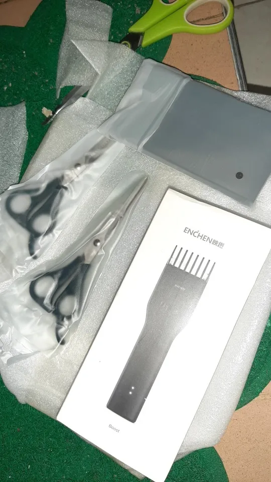 Упаковка, на удивление, абсолютно целая. Машинка работает. Смущает, что верхний нож из пластика. Но стрижет, пока нормально.