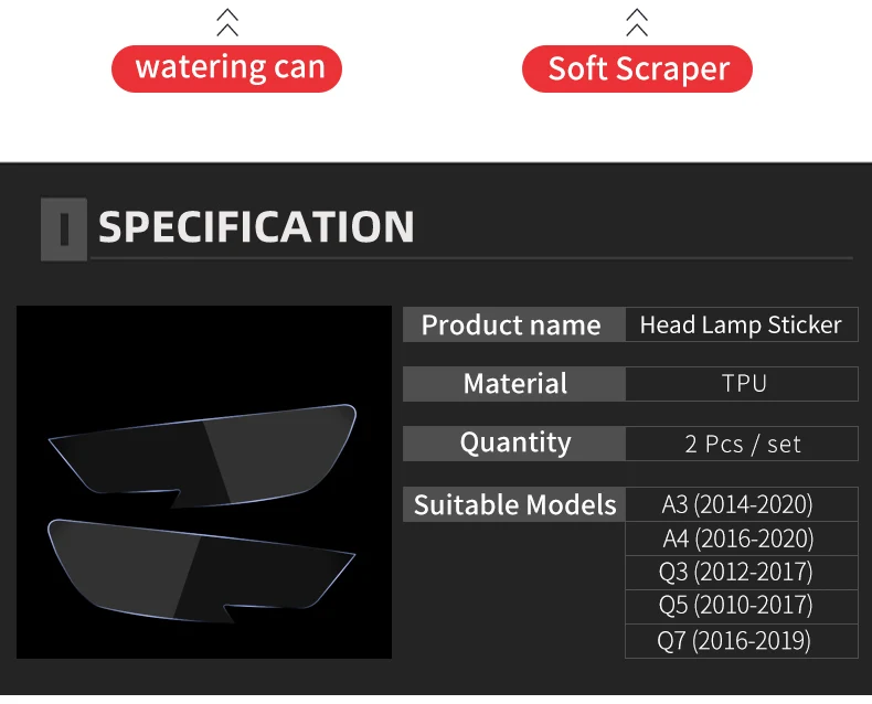 Товар: Защитная пленка на головную лампу Audi Материал: ТПУ Подходит для: Audi A3 S3 (2014-2020) Audi A4 S4 (2016-2020) Audi Q3 (2012-2017) Audi Q5 (2010-2017) Audi Q7 (2016-2019) Посылка включает в себя: 2 шт./компл. Бесплатные инструменты для установки: Лейка и мягкий скребок, если ваши ручные возможности относительно слабы, вы можете найти профессионального мастера установки Мы ориентируемся на предоставление высококачественных продуктов