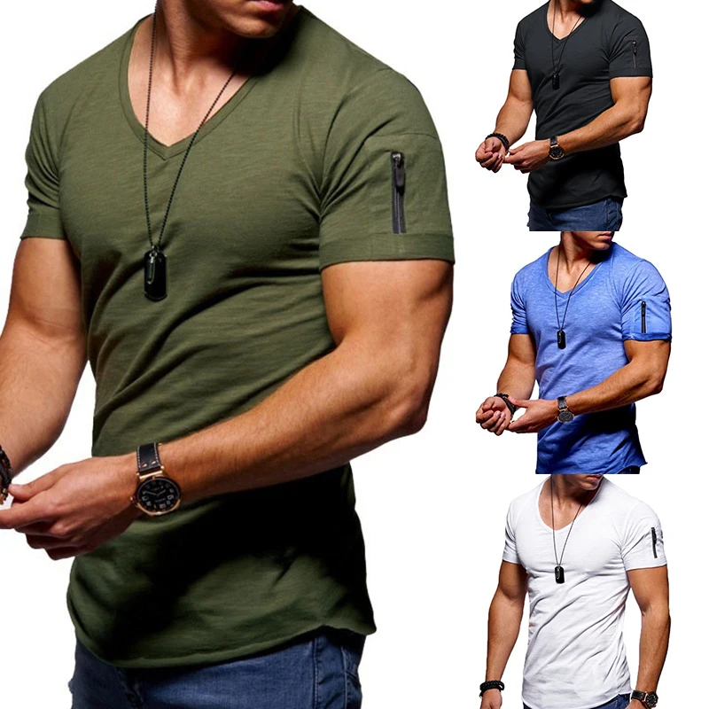 Мужская футболка на молнии, с коротким рукавом и V-образным вырезом, Повседневная, уличная одежда для фитнеса, размеры США S-2XL