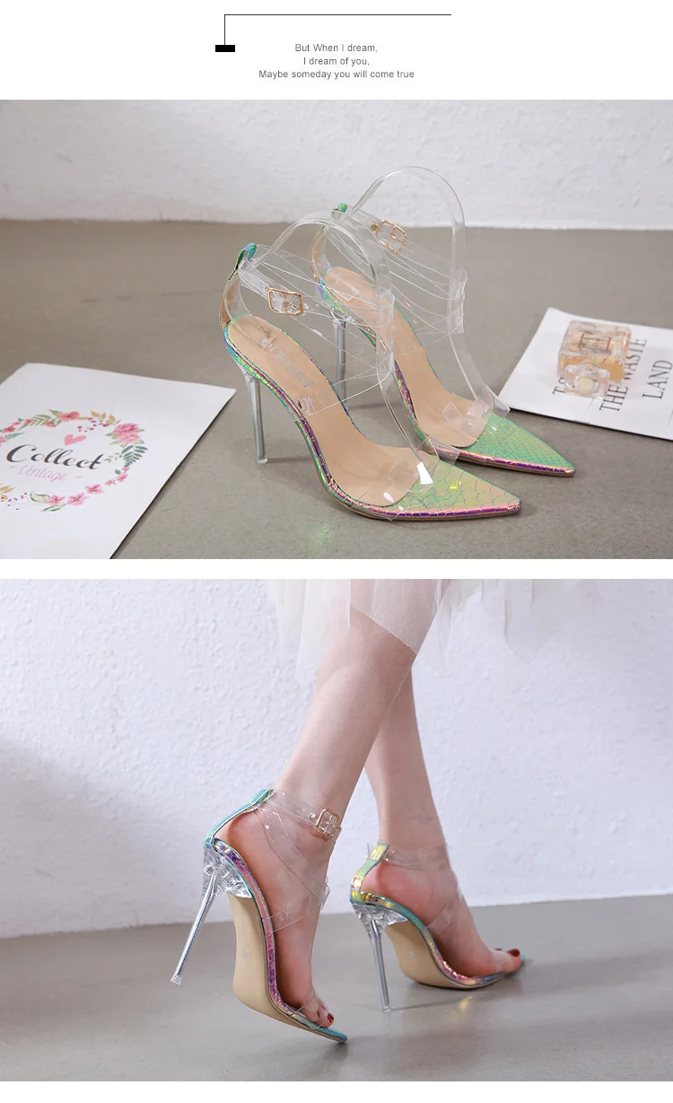 Прозрачные женские босоножки; Туфли-лодочки на очень тонком высоком каблуке с острым носком и ремешком с пряжкой; Яркие туфли из искусственной кожи для свадебной вечеринки; Размеры 35-42