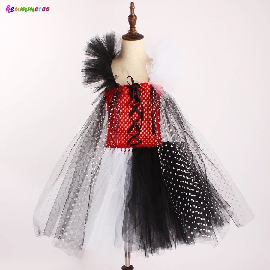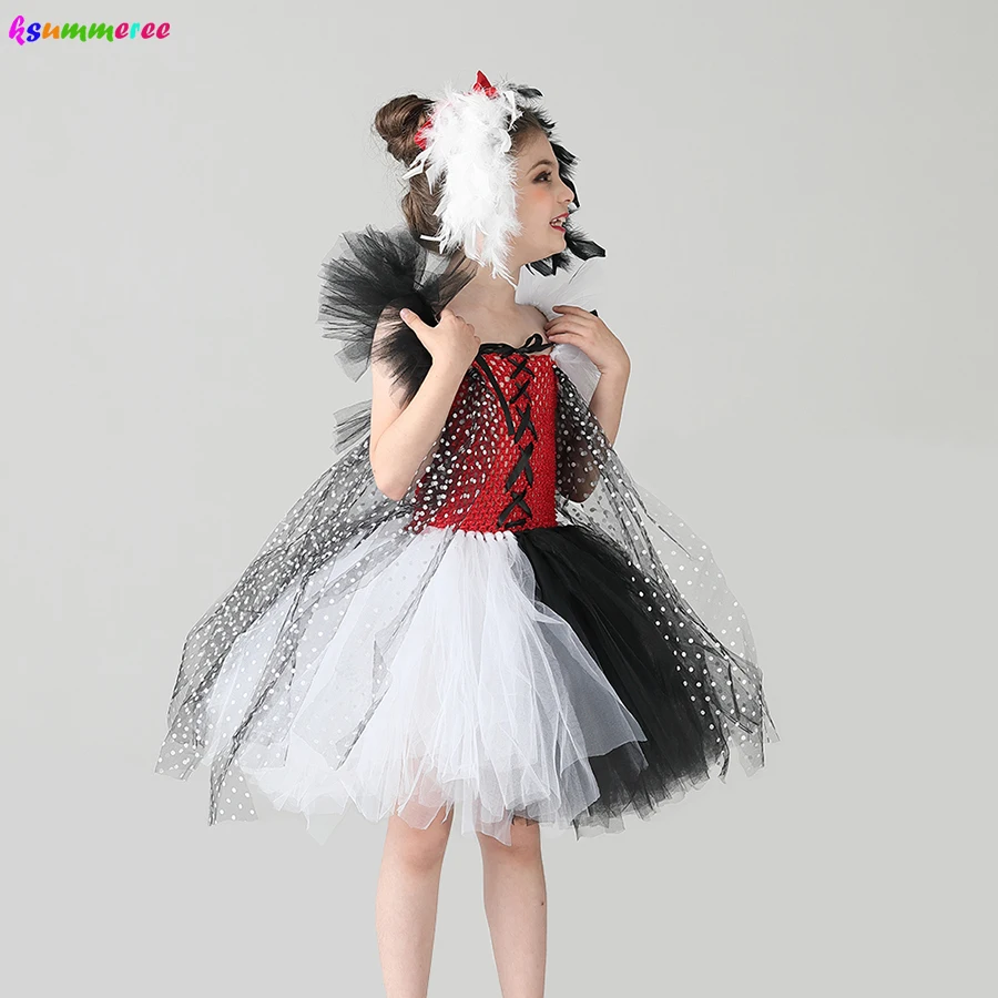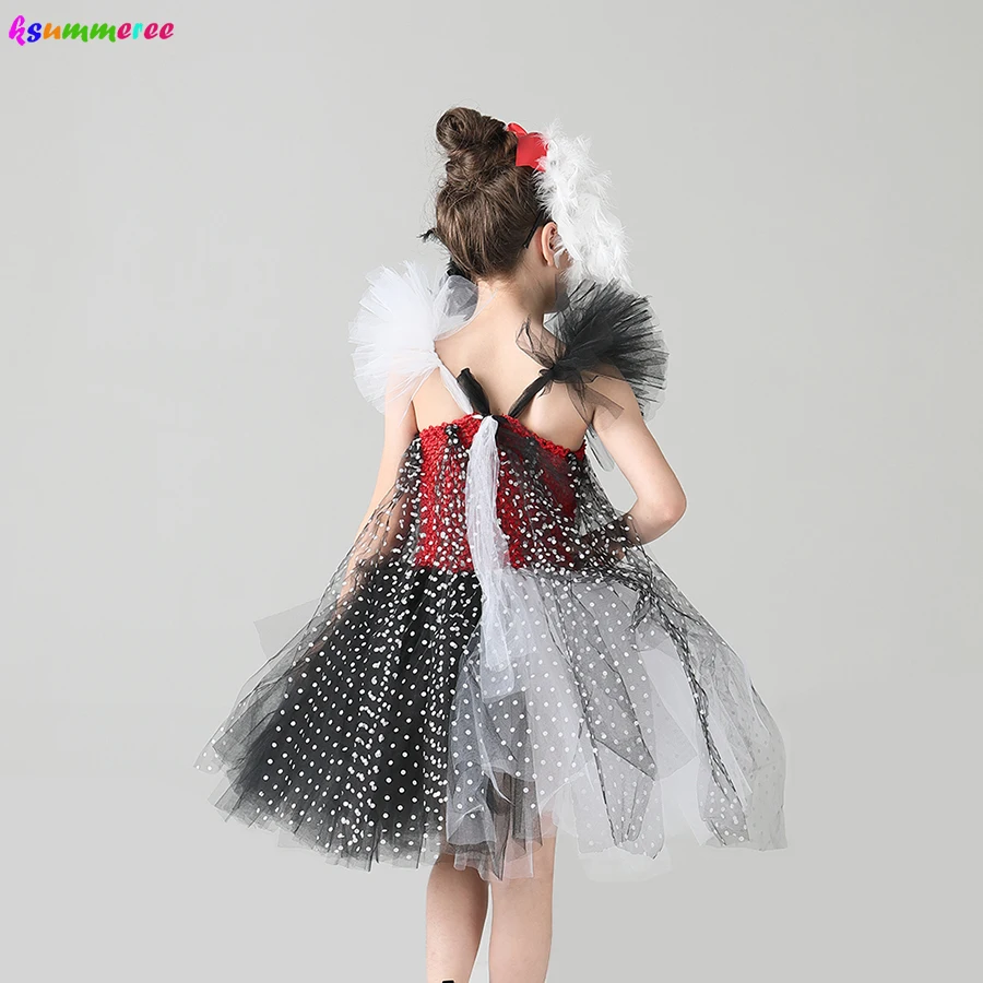 Злой мадам Круэлла де Виль Дети Туту костюм далматинцы девушки Хэллоуин нарядное платье-пачка с повязкой на голову в горошек девушка наряд