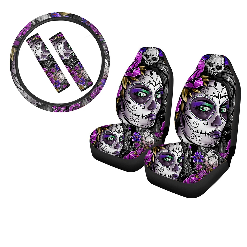 Мягкие чехлы для автомобильных сидений INSTANTARTS с принтом в виде Дня мертвых сахарных черепов, 5 шт., нескользящий чехол на руль, чехлы для ремня безопасности автомобиля