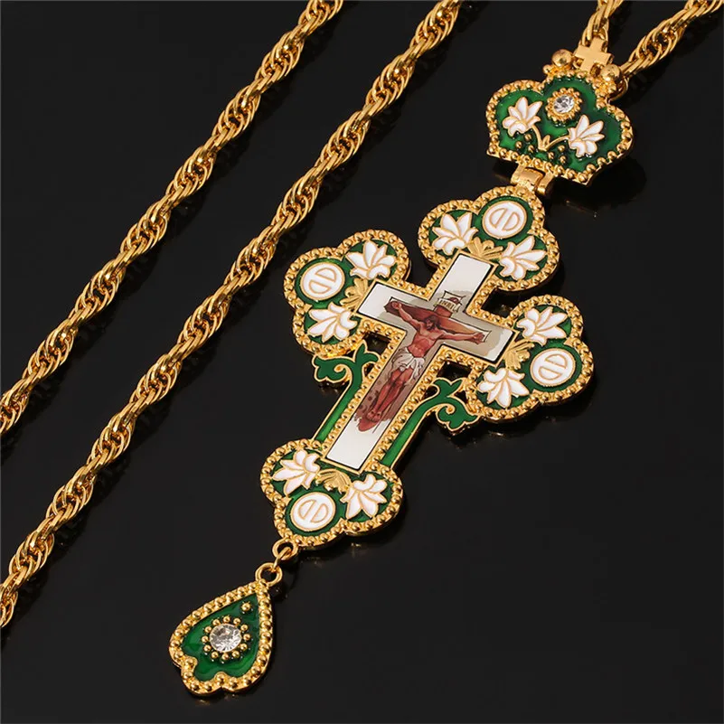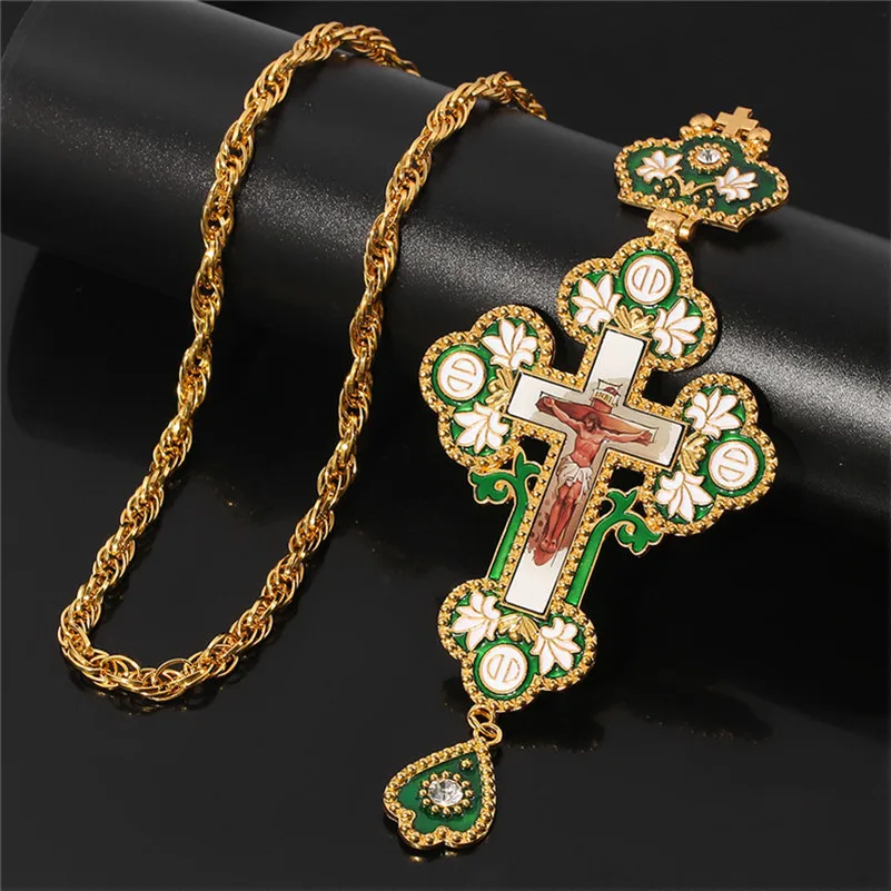 Христианский крест ожерелье для женщин мужчин Зеленый Эмаль Цветок католическая ортодоксальная Большой значок ожерелье грудной крест