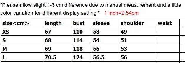 Размер <см> Длина Бюст Рукав Плечо Талия XS 67 110 53 49 S 68 114 54 51 М 69 118 55 53 L 70,5 124 56,5 56