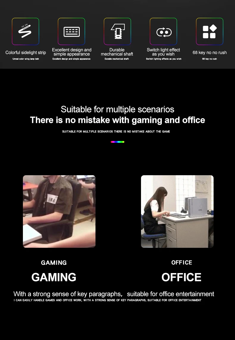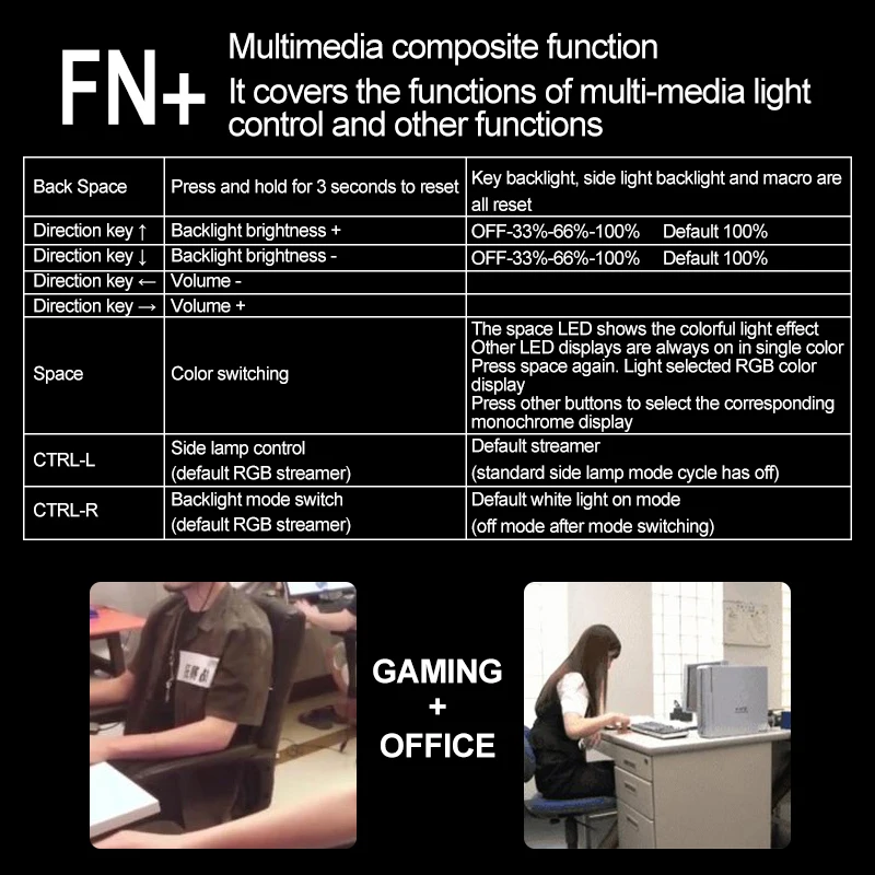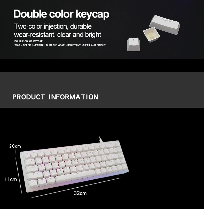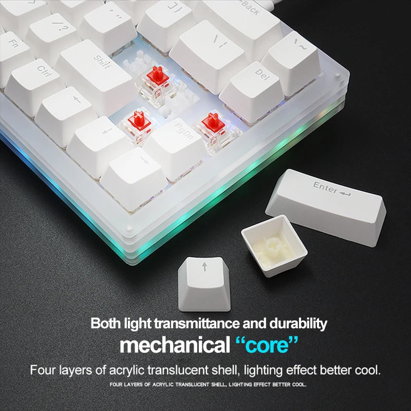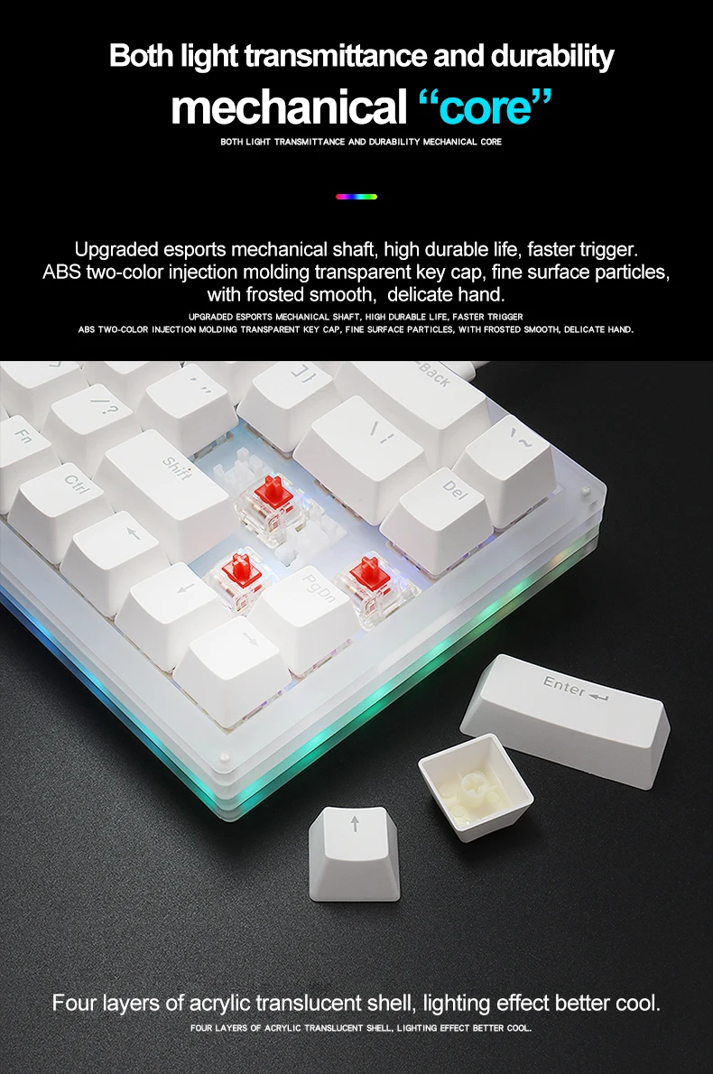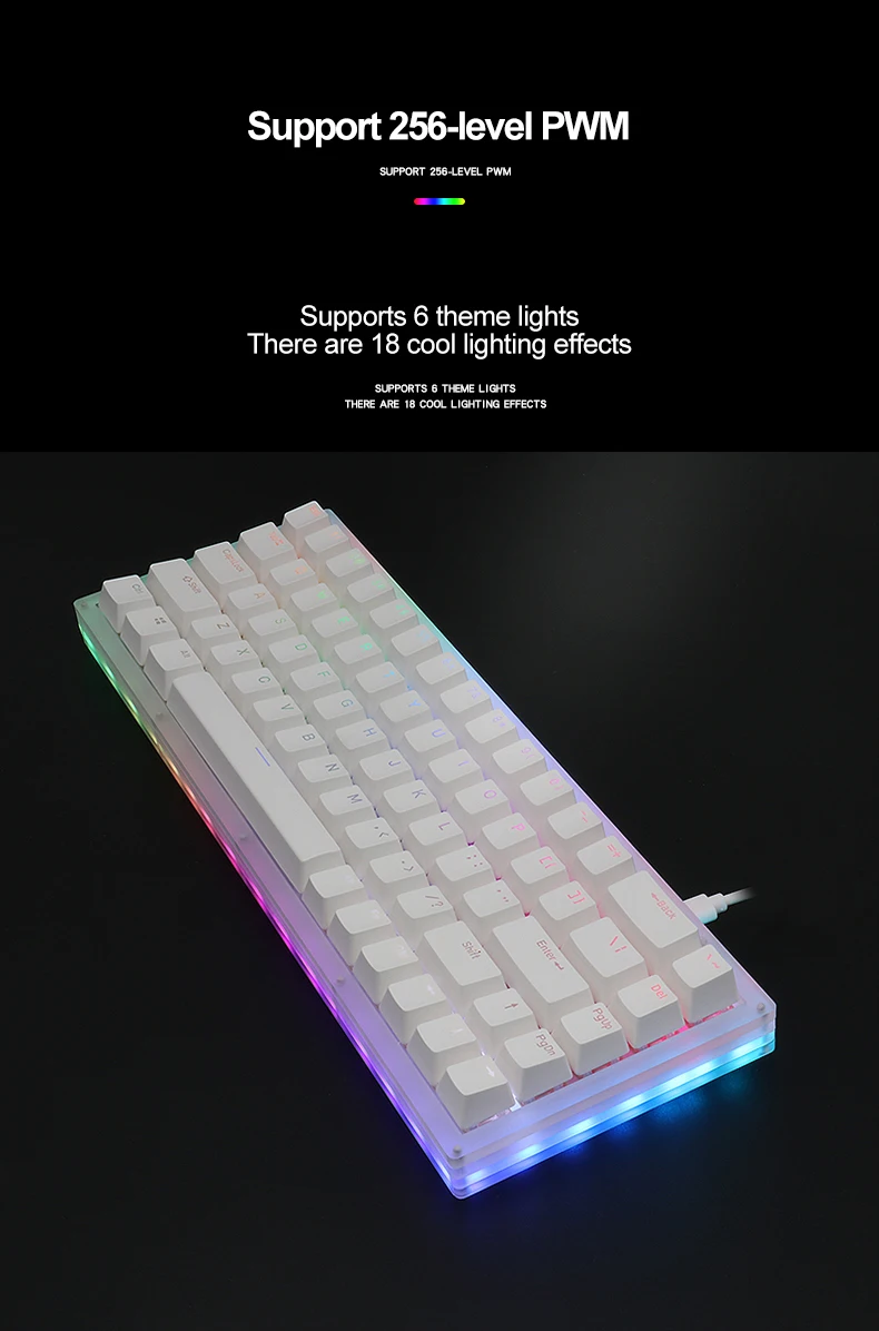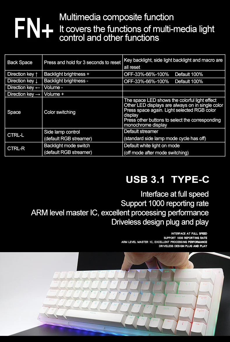 1. Клавиатура из полимерного метилаМетакрилат по технологии ЧПУ.2. Интерфейс USB 3,1 типа C, скорость передачи 40 Гбит/с.3. Флэш-память для автоматического сохранения последней настройки.4. Множество режимов прохласветильник щения на выбор, комбинация цветов RGB для достижения, цвет по вашему желанию.5. Погружное золото FR-4 PCB technic.6. Подключаемый USB-кабель для компактного приема и удобства переноски.Иллюстрация функции:1.FN + ↓ = увеличение яркости подсветкиОт OFF-33%-66%-100%, по умолчанию 100%2.FN + ↓ = уменьшение яркости подсветкиОт OFF-33%-66%-100%, по умолчанию 100%3.FN + Del = изменение эффектов подсветки клавиатуры, всего 18 типов светильник вых эффектов.4.FN + Ins = управление бокосветильник томЭффекты (динамический обод RGB по умолчанию.5.FN + Backspce = Нажмите и удерживайте в течение 3 секунд, чтобы восстановить заводские настройки6.FN + ✮= снижение коэффициента светоотдачи7.FN + → = повышение эффективности светильник8.FN + HOME/End/INS/PGUP/PGDN = изменение эффектов подсветки клавиатуры, всего 18 типов светильник вых эффектов.