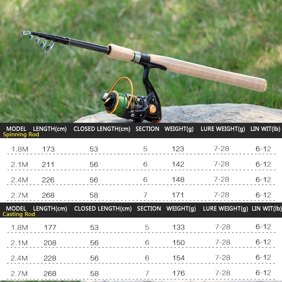 Рыболовная телескопическая удочка, кастинговое удилище, углеродное волокно, деревянная ручка, вес приманки 7-28 г, 1,8 м, 2,1 м, 2,4 м, 2,7 м