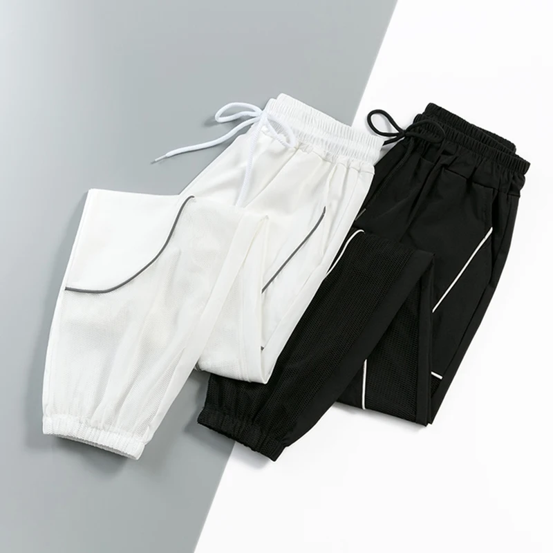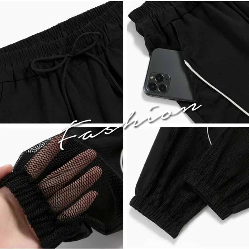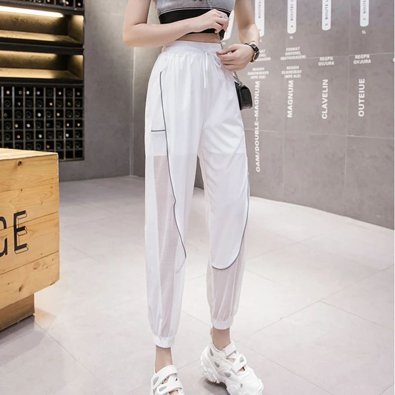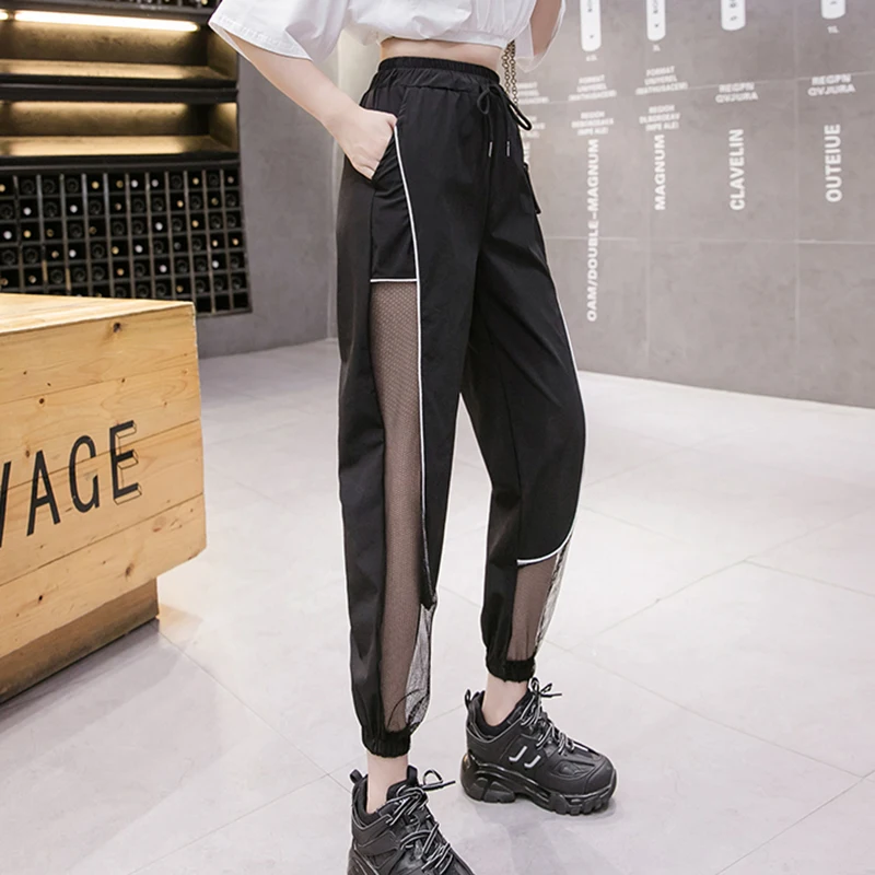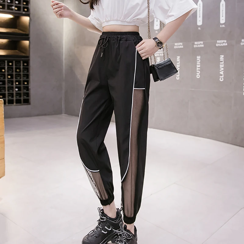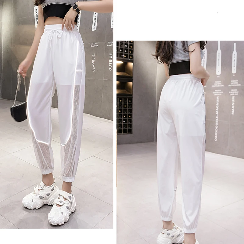 Брюки женские тонкие с завышенной талией, уличная одежда, свободные сетчатые повседневные отражающие шаровары до щиколотки в стиле пэчворк, черные, лето 2022