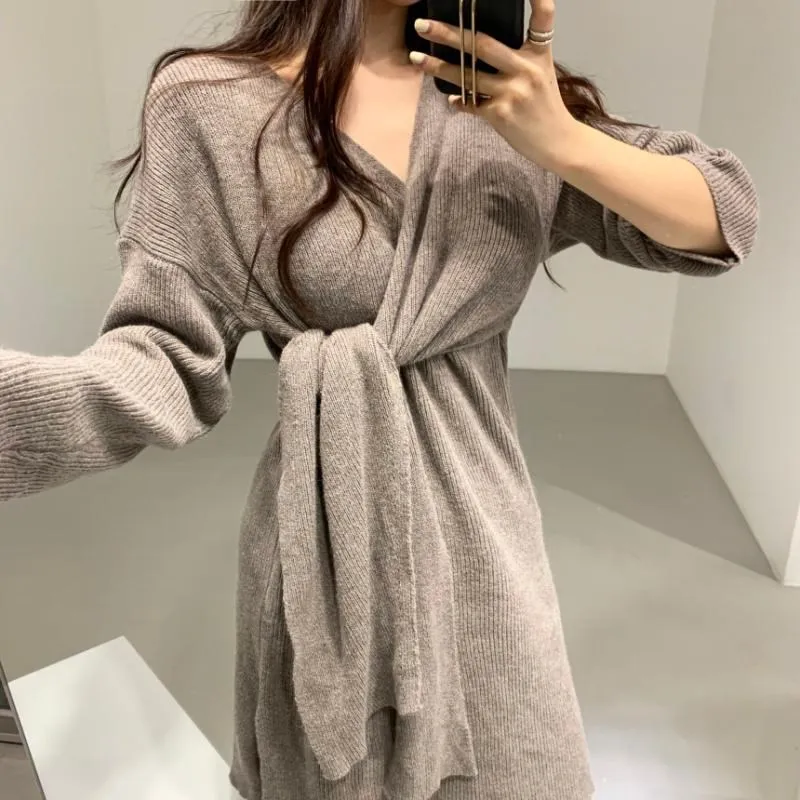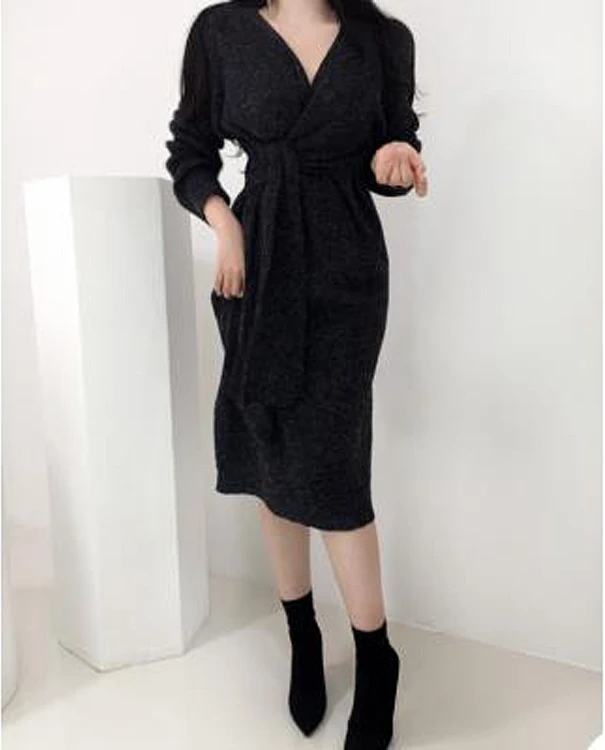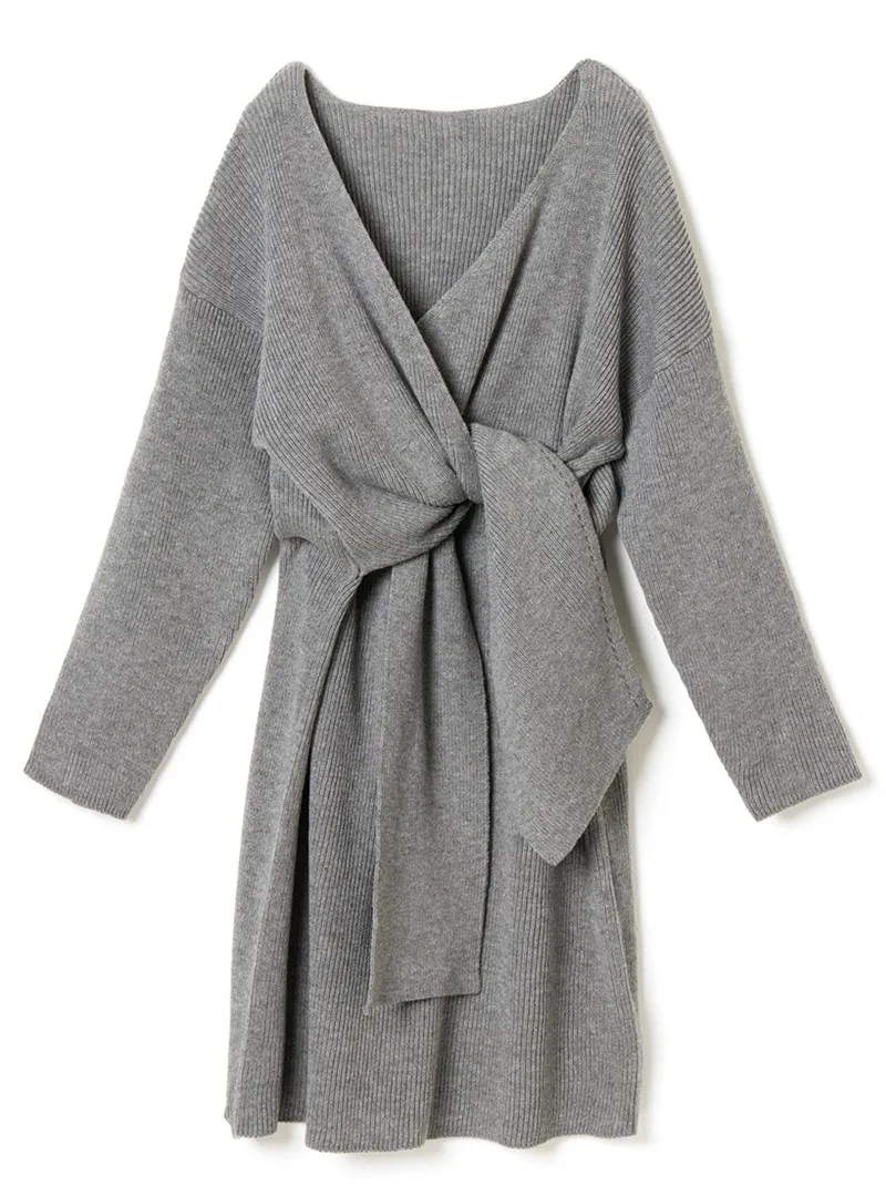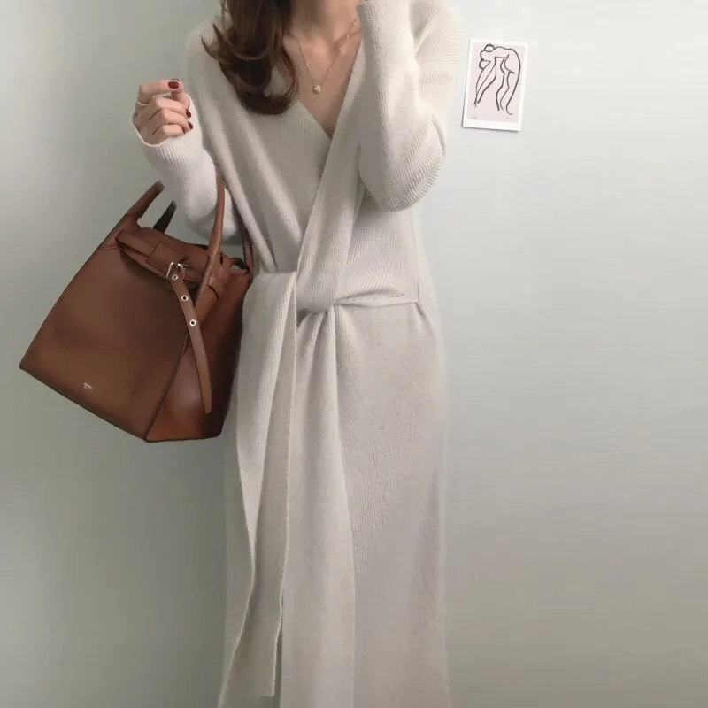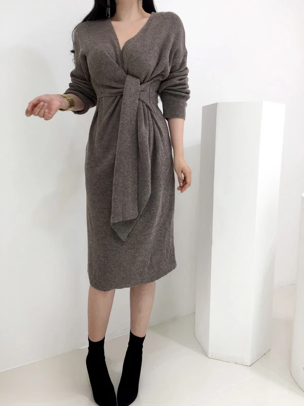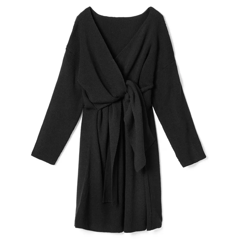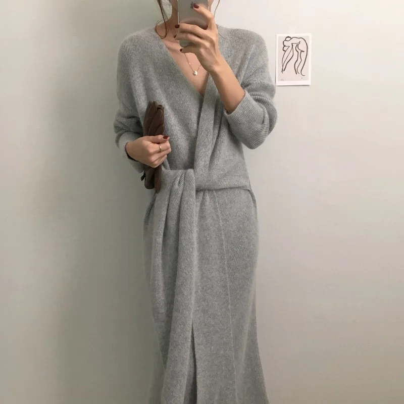 REALEFT Новинка 2020 Осень Зима теплые вязаные платья спереди с перекрестным v-образным вырезом миди платье с длинным рукавом элегантное Бандажное прямое платье