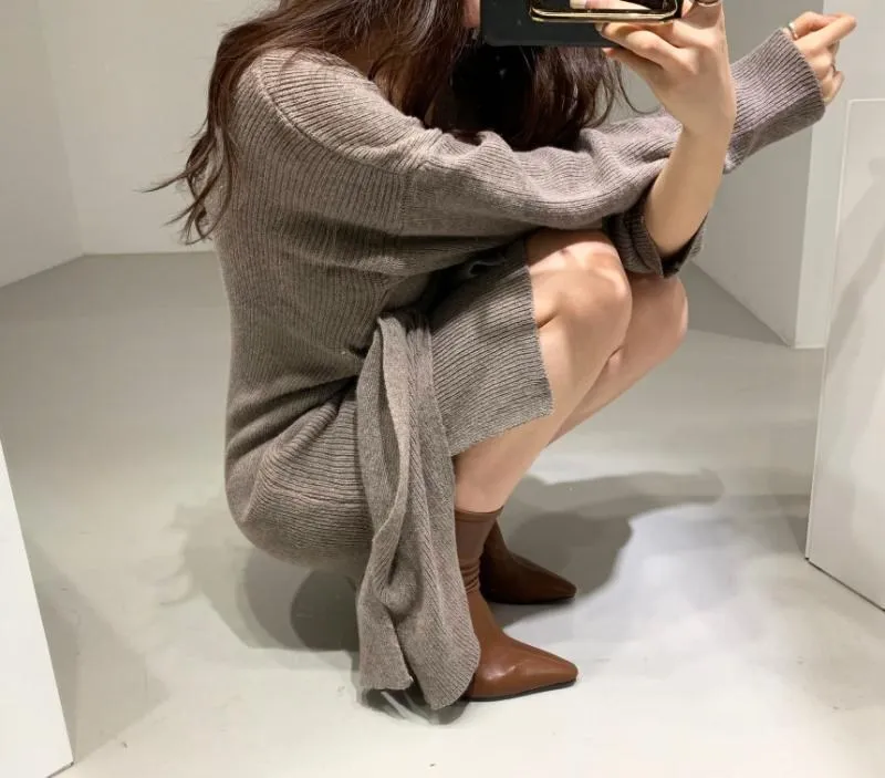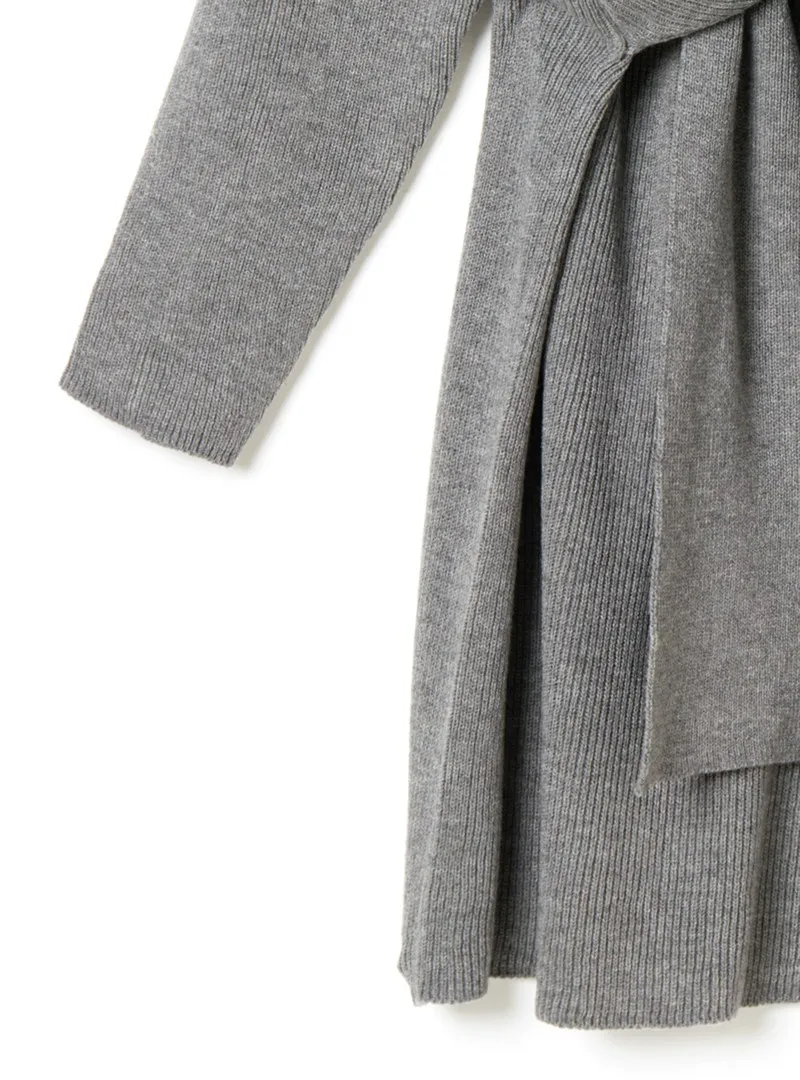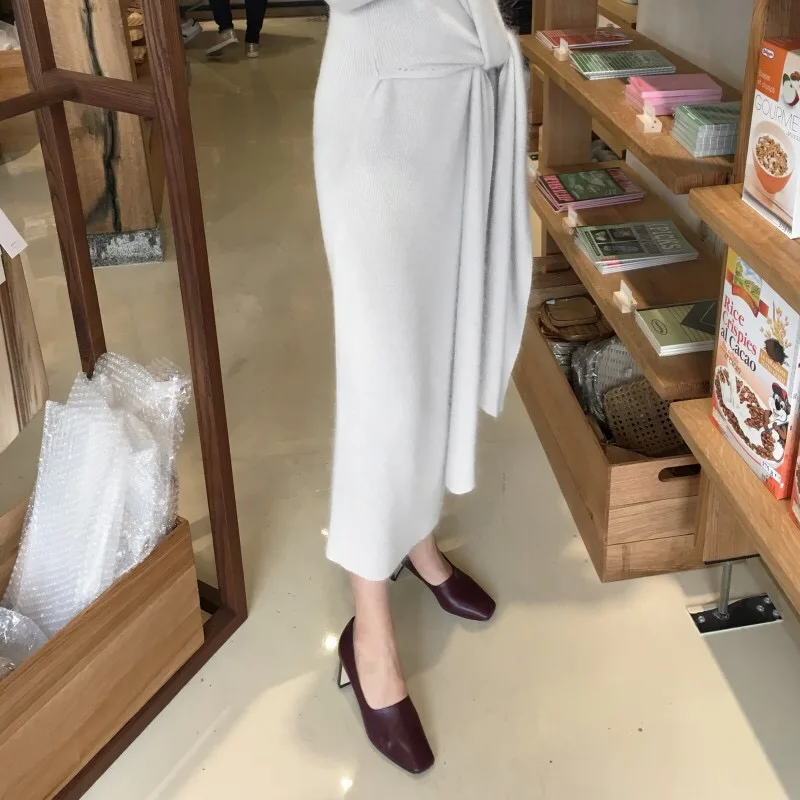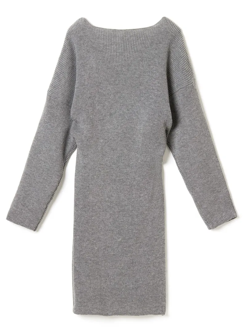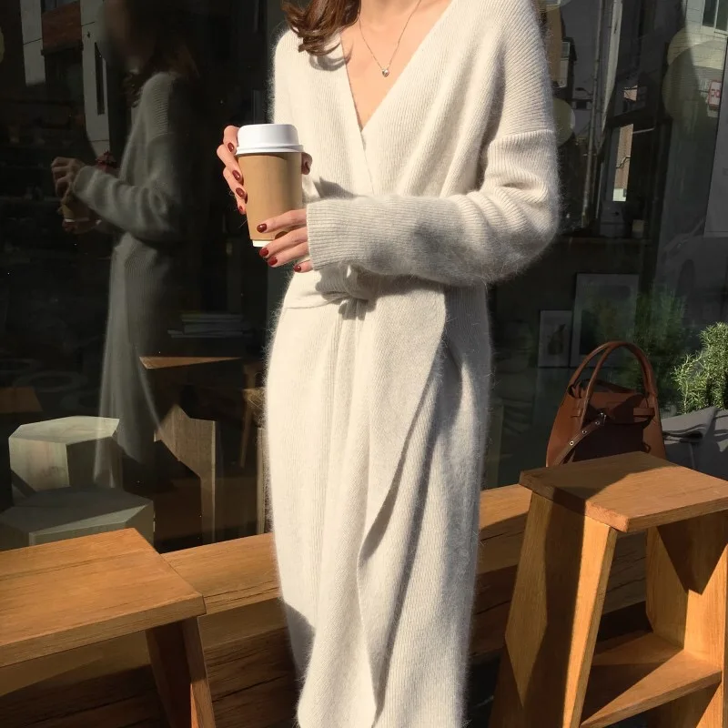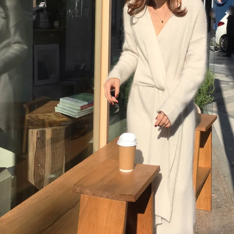 REALEFT Новинка 2020 Осень Зима теплые вязаные платья спереди с перекрестным v-образным вырезом миди платье с длинным рукавом элегантное Бандажное прямое платье