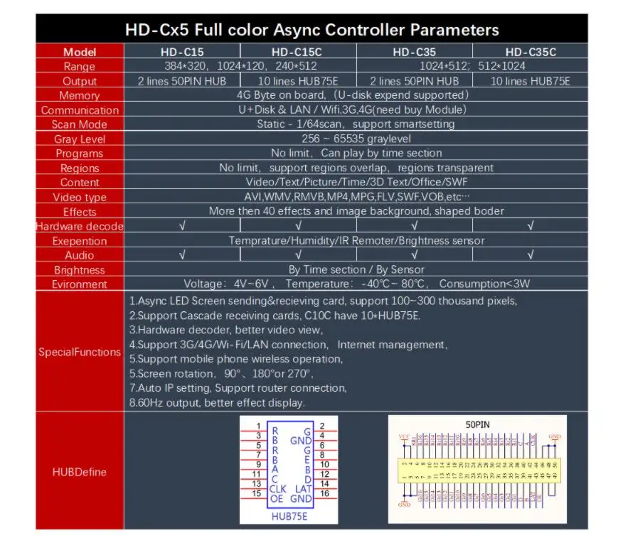 C15(384*320), C15C(384*320), C35(1024*512),C35C(1024*512) C15/C15C самый широкий 1024, самый высокий 512, C35/C35C самый широкий 1024, самый высокий 1024 Можно использовать для одной принимающей карты Оснащен Wi-Fi, управлением мобильными приложениями Поддержка 3G/4G (опционально), дистанционное управление кластером через Интернет Поддержка декодирования видео, выход 60 Гц Память 4 Гб, Расход памяти на U-disk ОС Android, четырехъядерный процессор Cortex-A9 1,6 ГГц