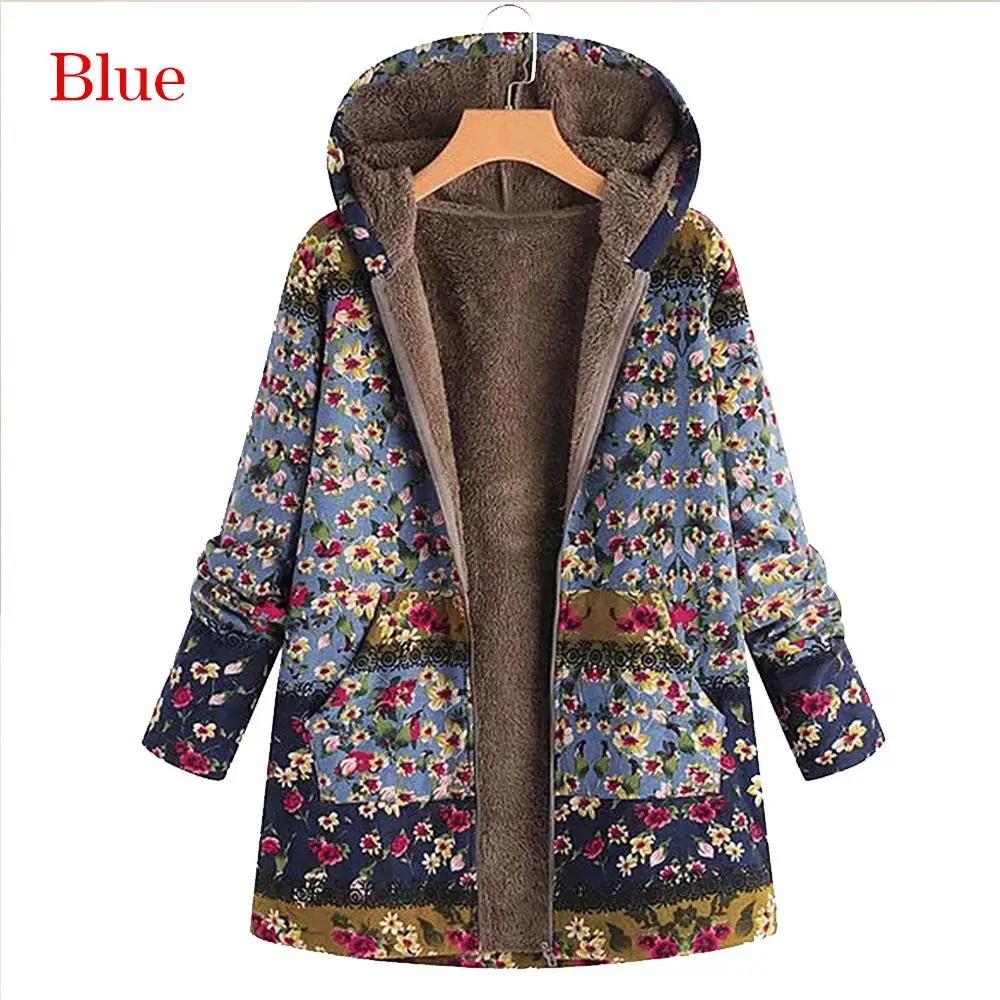 Женская куртка с цветочным принтом, зимняя теплая плюшевая пушистая парка, ветровка, повседневное винтажное пальто на молнии с капюшоном и карманами, большие размеры