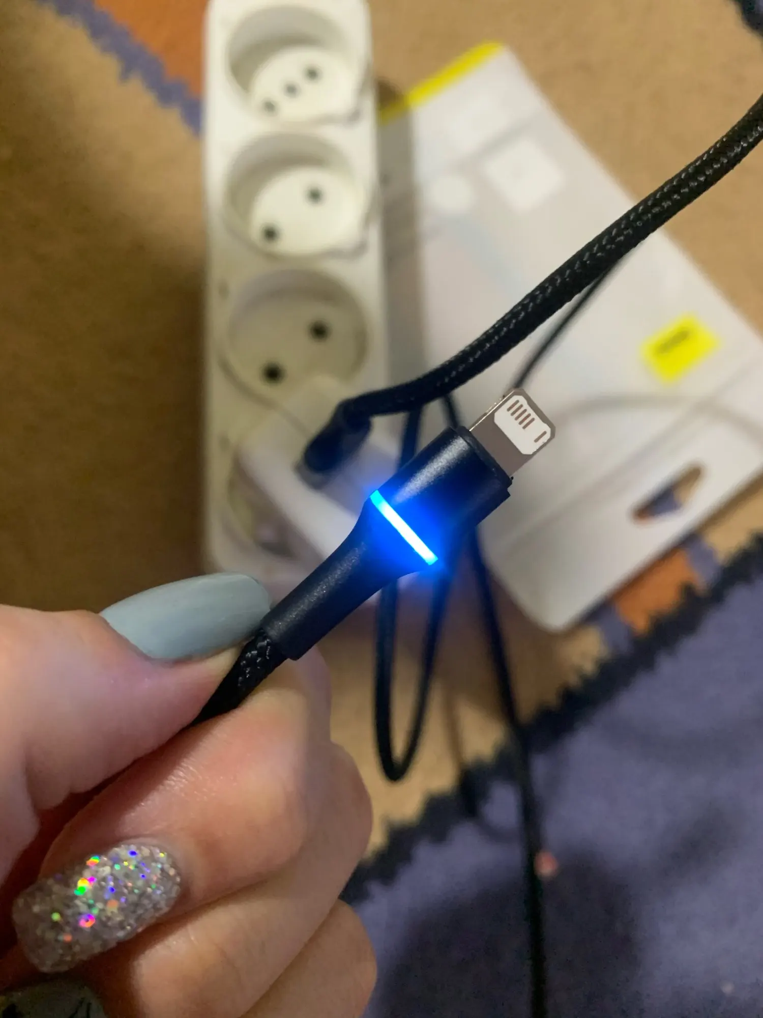 Доставка заняла 30 дней. Подсветка на вилке переливается разными цветами. Телефон заряжает. Короткий провод удобен для пауэрбанка. Есть лента-органайзер.