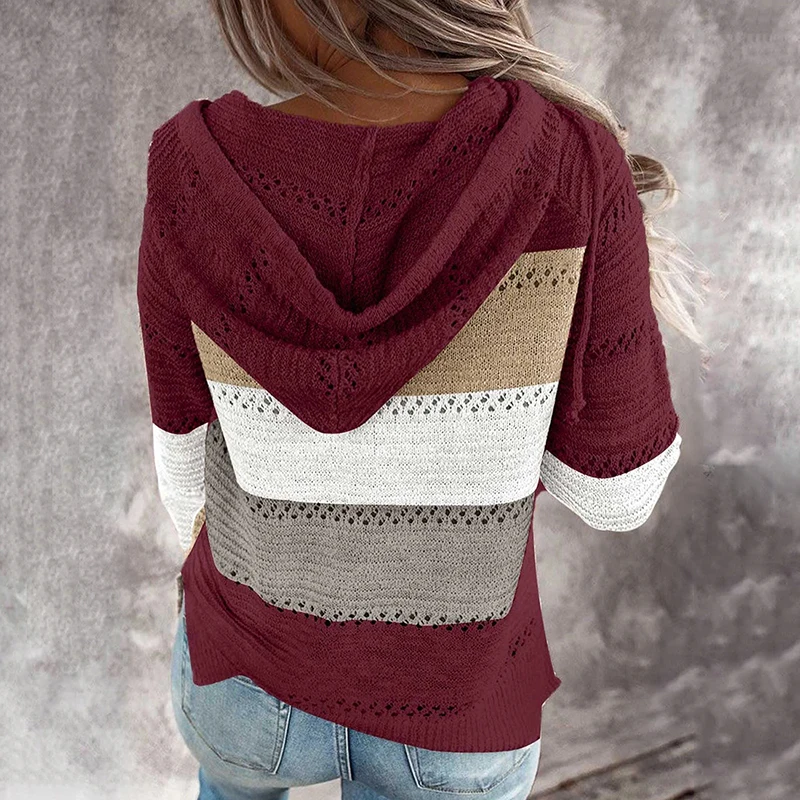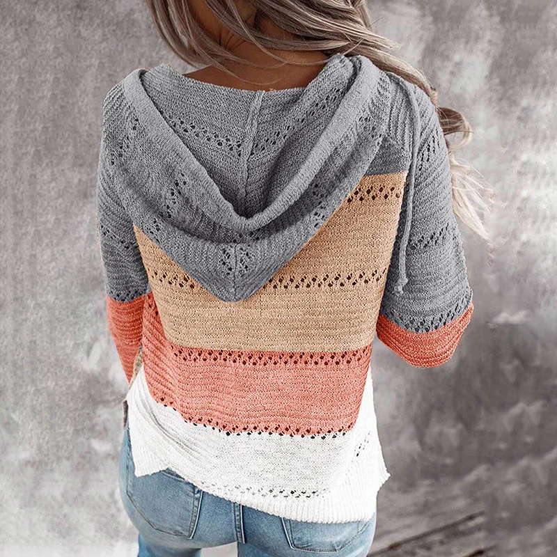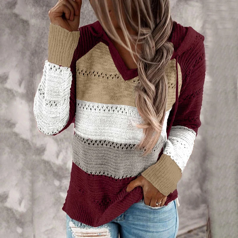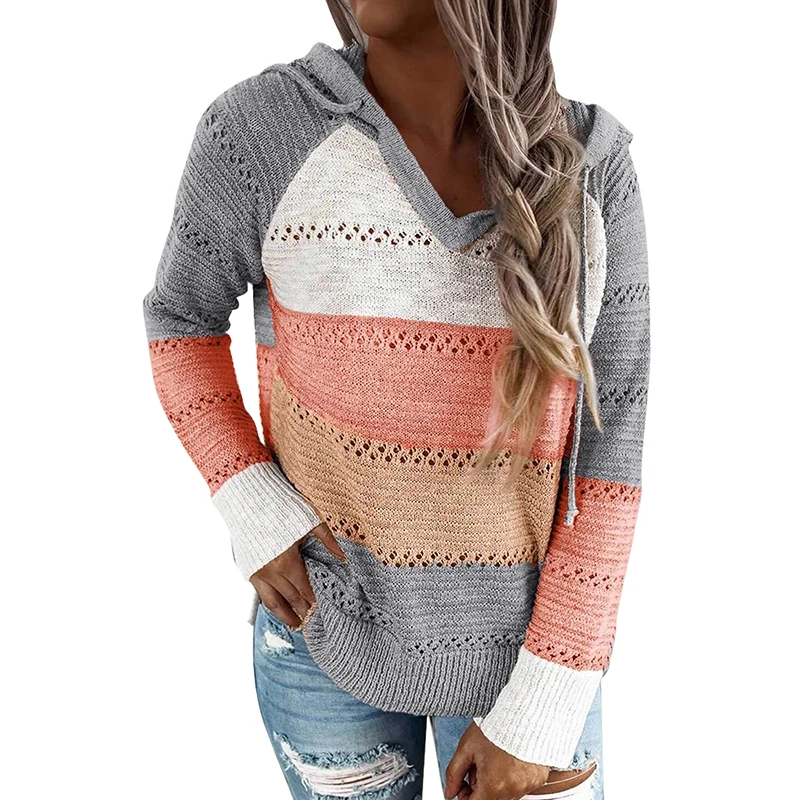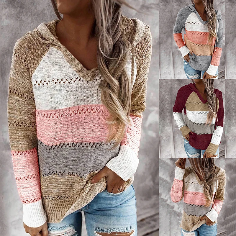 Женский свободный свитер с капюшоном, повседневный трикотажный пуловер в полоску, с вырезами, в стиле пэчворк, осень