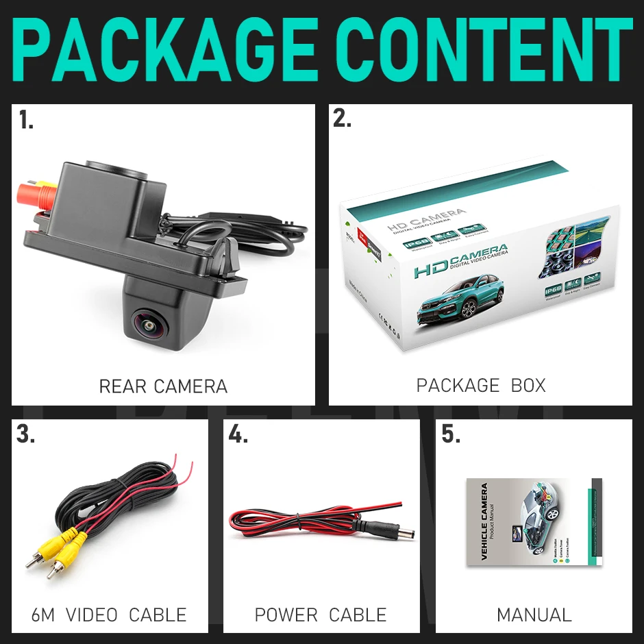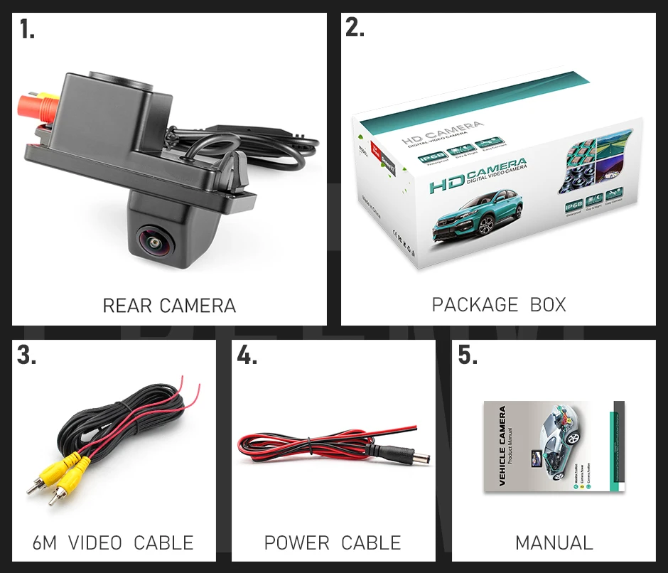1. Задняя камера2 посылка3. Видеокабель (6 м)4. Кабель питания5. Руководство