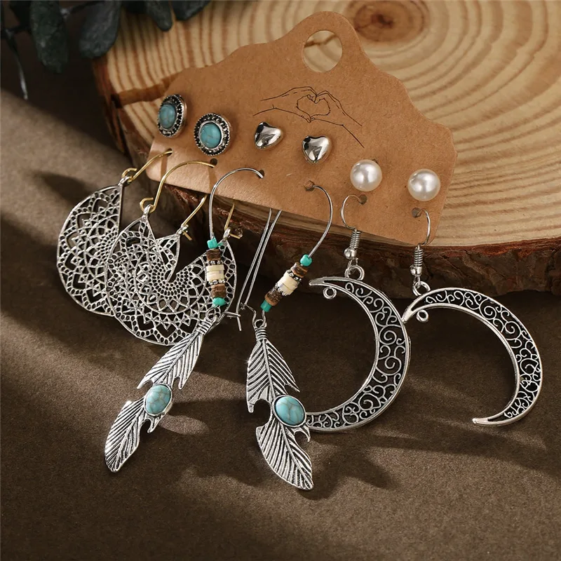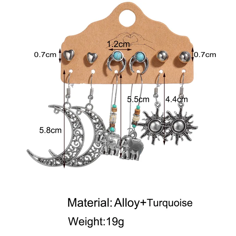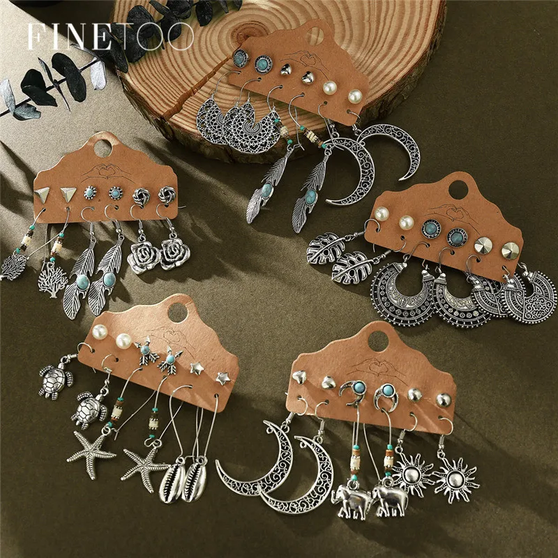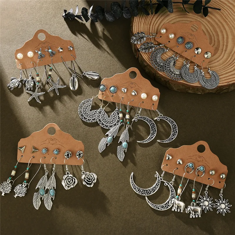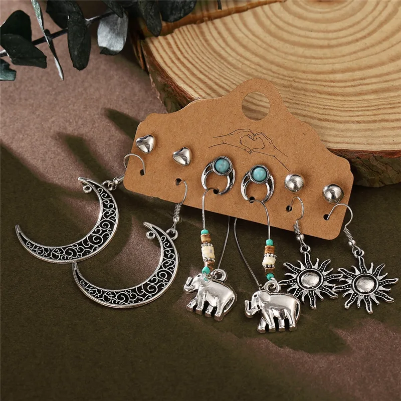 Серьги в стиле бохо, винтажный стиль, Ретро стиль, античное солнце, луна, геометрические серьги, набор, перо, слон, черепаха, морская звезда, ракушка, висячие серьги
